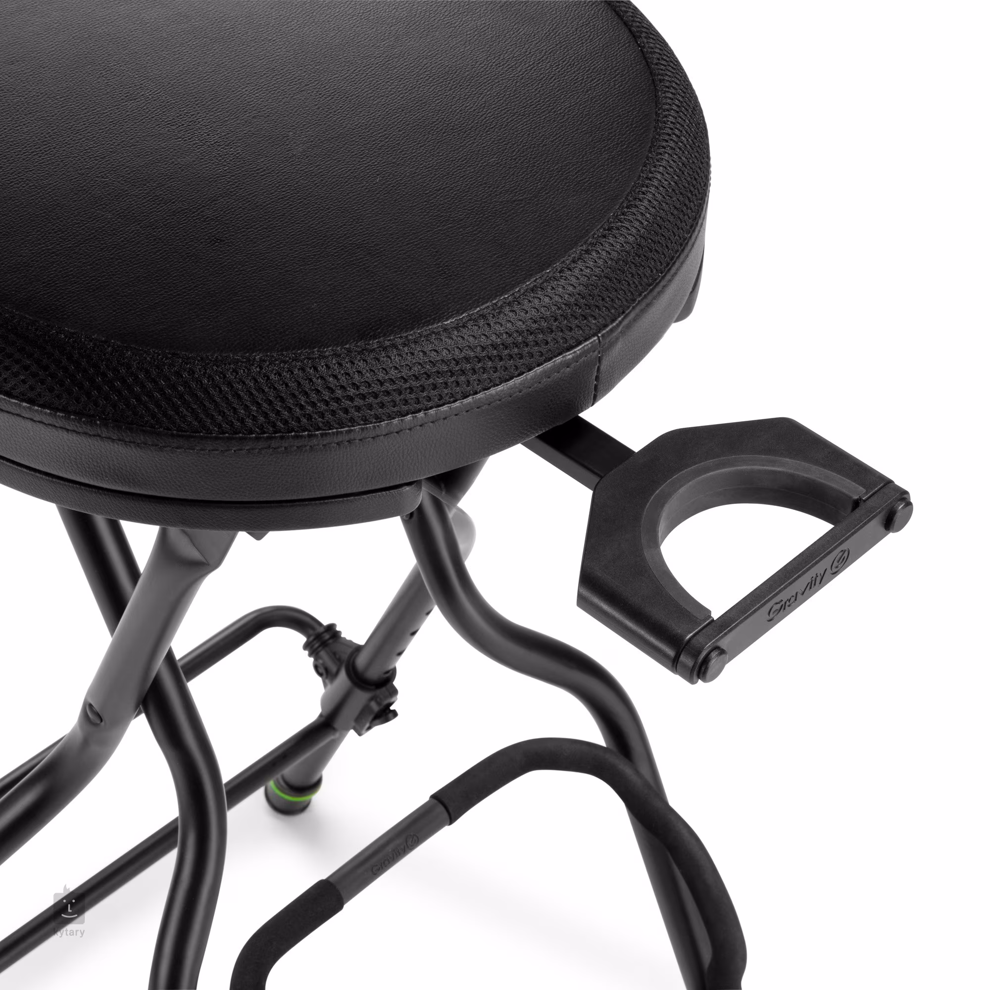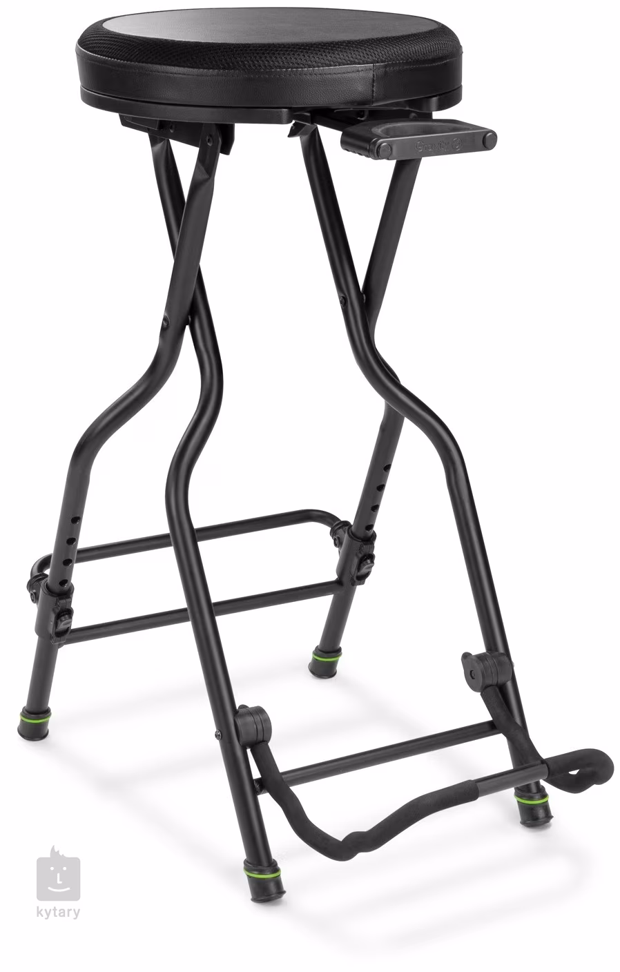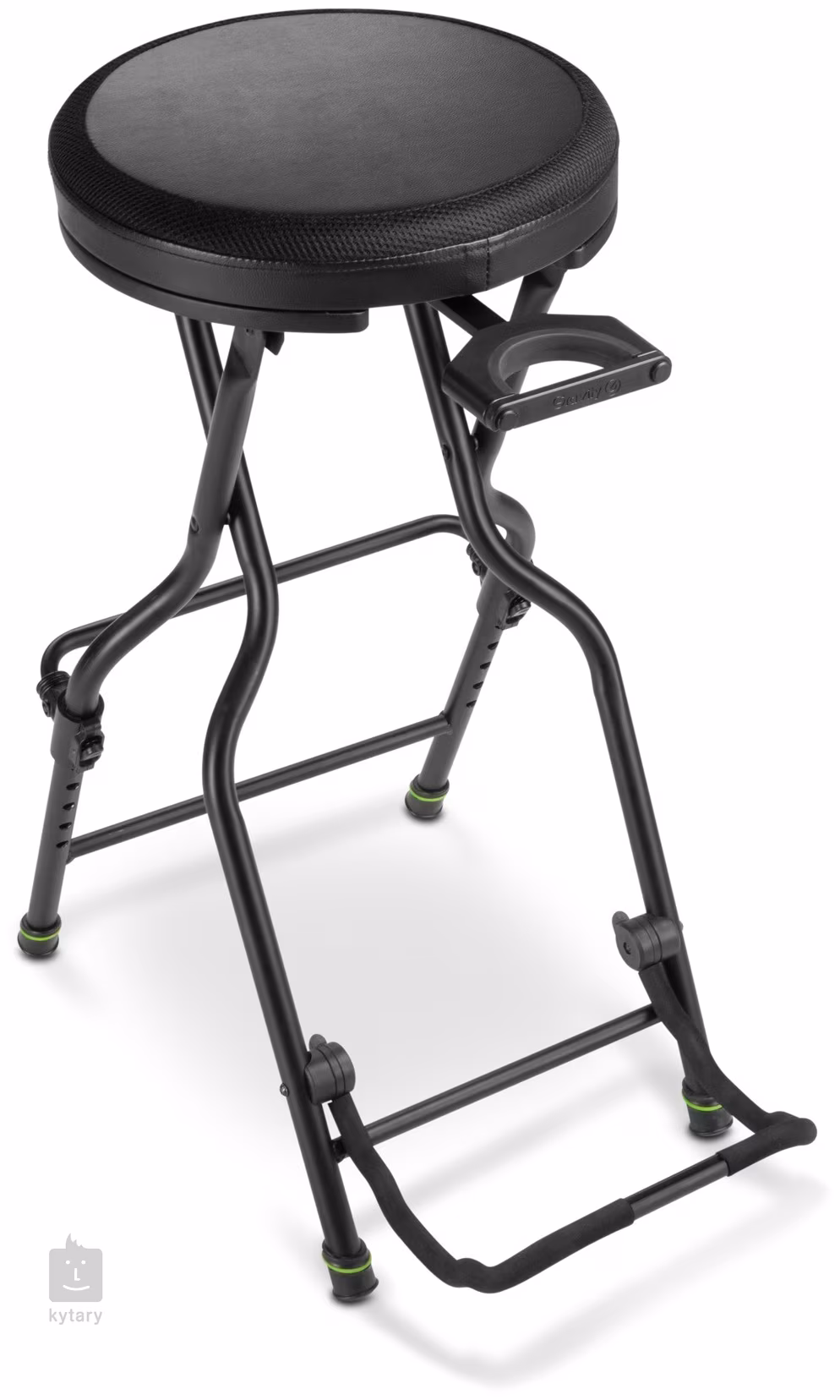 Okrem pohodlného sedenia vám táto dômyselne navrhnutá gitarová stolička ponúka aj také veci, ako je držiak na gitaru a nastaviteľná opierka nôh. Sedadlo s priemerom 340 mm je vyrobené z kombinácie látky a kvalitnej koženky, vďaka čomu je protišmykové a priedušné. Konštrukcia stojana je potom vyrobená z kombinácie tlakovo liateho hliníka a ocele, čo zaručuje nielen pevnosť a stabilitu, ale aj nízku hmotnosť. V prípade potreby možno stoličku zložiť do kompaktných rozmerov, takže je ideálna na časté cestovanie. Na bočnej strane nájdete výsuvný držiak na gitaru, ktorý možno v prípade potreby úplne skryť, stojan ľahko a bezpečne udrží väčšinu štandardných akustických a elektrických gitár. Ďalšou špeciálnou vlastnosťou tejto stoličky je nastaviteľná opierka nôh (v rozsahu 180 - 300 mm), ktorá zaručuje pohodlné hranie za každých okolností.