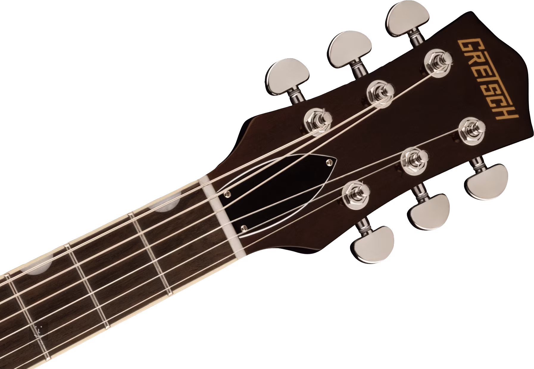 Struny sú uložené na hmatníku zo syntetickej kosti v ladiacich mechanikách Die-Cast a strunníkoch Wrap-Around. Pekné spracovanie podčiarkuje pickguard v povrchovej úprave Cream Plexi so zlatým logom Gretsch, lemovanie tela a logo spoločnosti na hlave.
