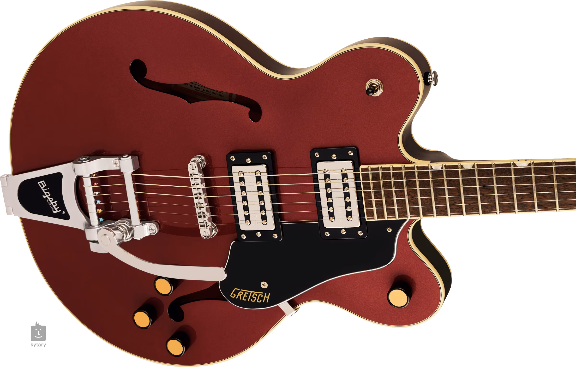 Struny sú ukotvené prostredníctvom kosteného nultého pražca vo firemných die-cast ladiacich mechanikách a prostredníctvom kobylky Adjusto-Matic v licencovanom tremole Bigsby B70. Klasický oku lahodiaci dizajn gitár Gretsch podčiarkuje množstvo štýlových prvkov - od klenutej konštrukcie tela s F-otvormi, elegantnej väzby s jemným nádychom patiny (Aged White), niklového hardvéru až po trojvrstvový čierny pickguard so zlatým logom Gretsch.