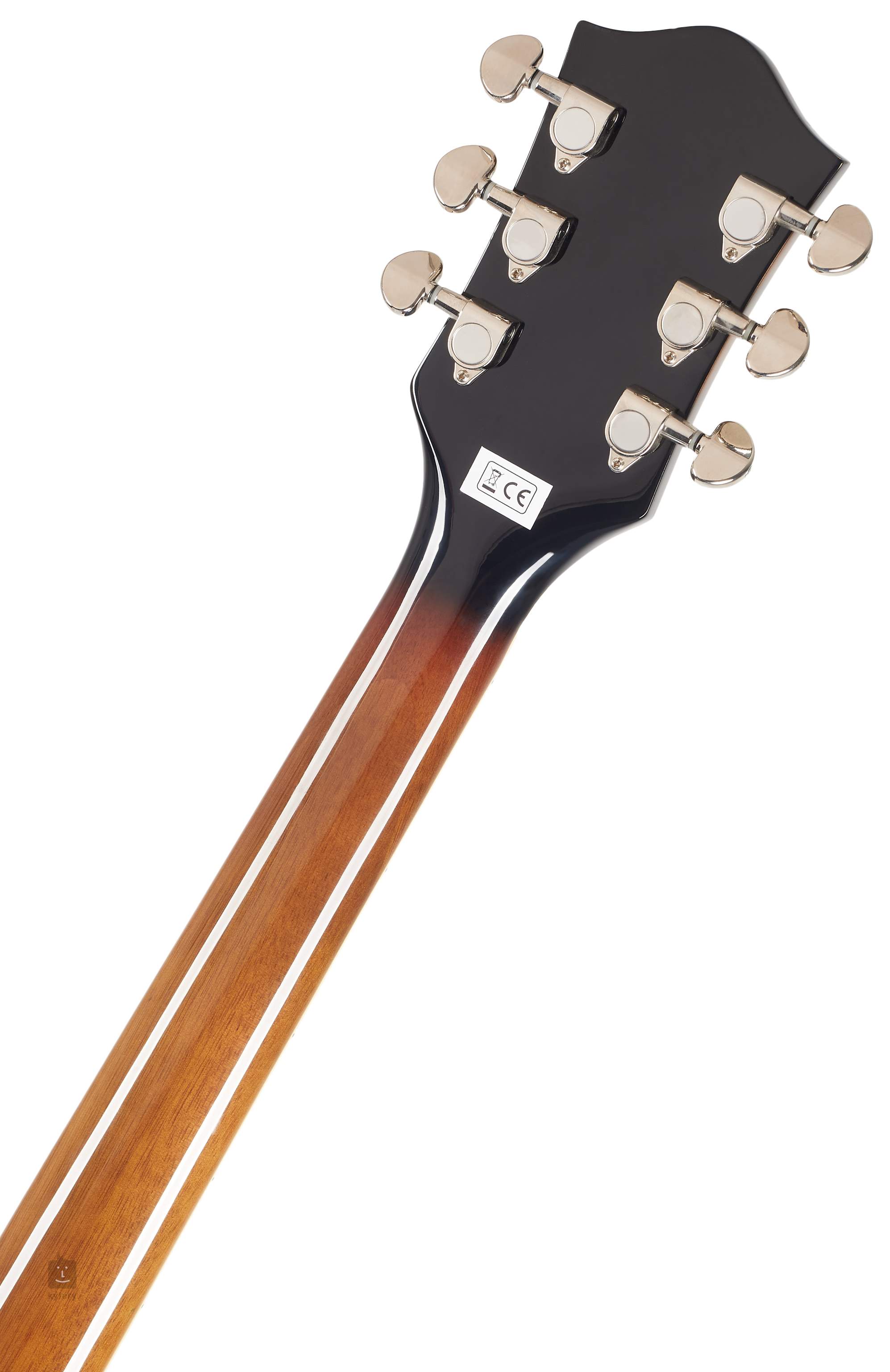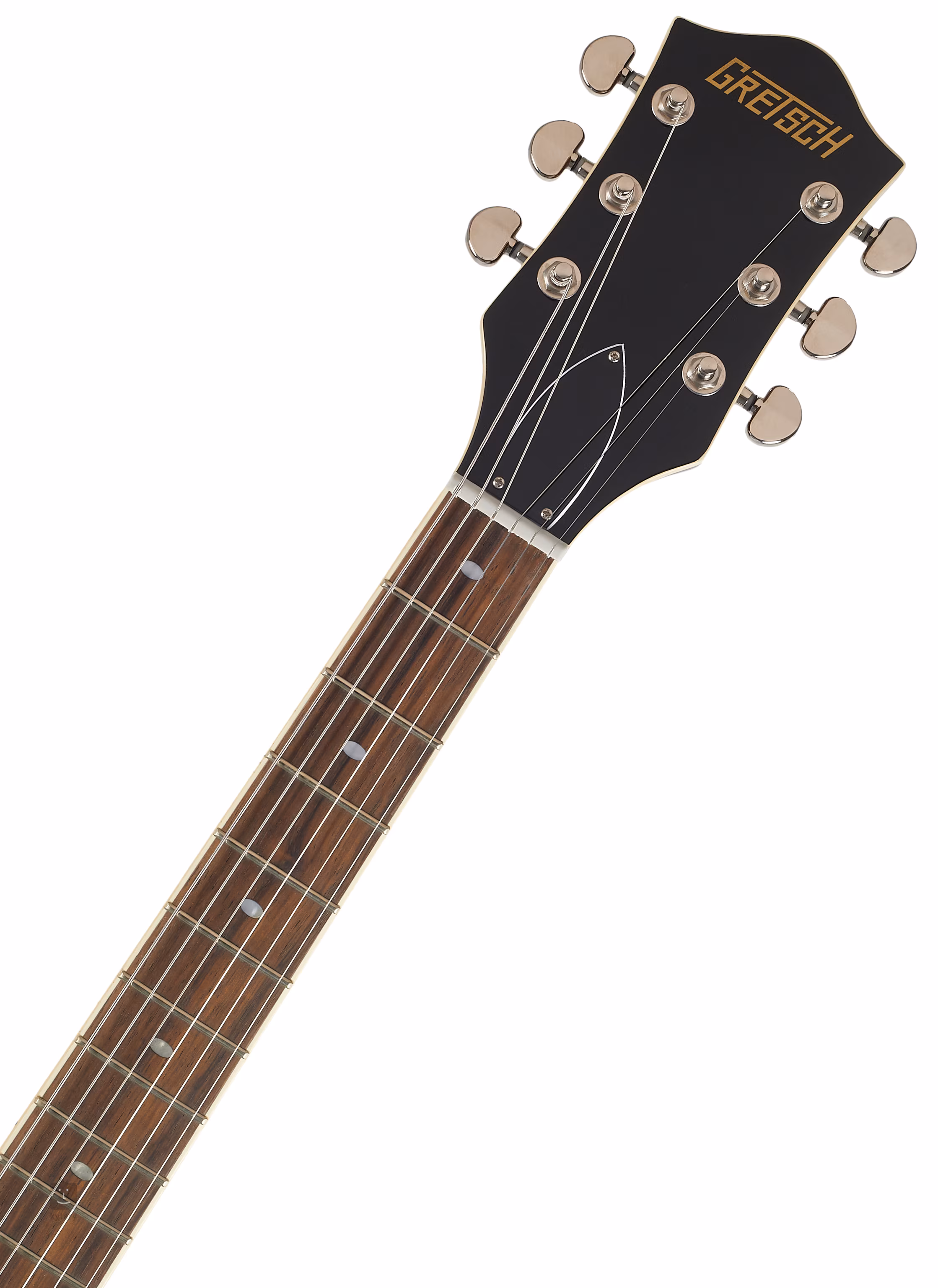 Presné ladenie zaručuje uchytenie strún prostredníctvom nultého pražca z umelej kosti vo firemných Die-Cast ladiacich mechanikách a v hlavici Adjusto-Matic. Licencované tremolo Bigsby B70 dodáva vašej hre jemné zvukové efekty. Klasický, oku lahodiaci dizajn gitár Gretsch podčiarkuje množstvo štýlových prvkov - od rozšírených F otvorov pre lepšiu akustickú projekciu, cez štylizované rámčeky snímačov, elegantné lemovanie s jemným nádychom patiny (Aged White) doplnené čiernymi a bielymi linkami, niklový hardvér až po čierny jednovrstvový pickguard.