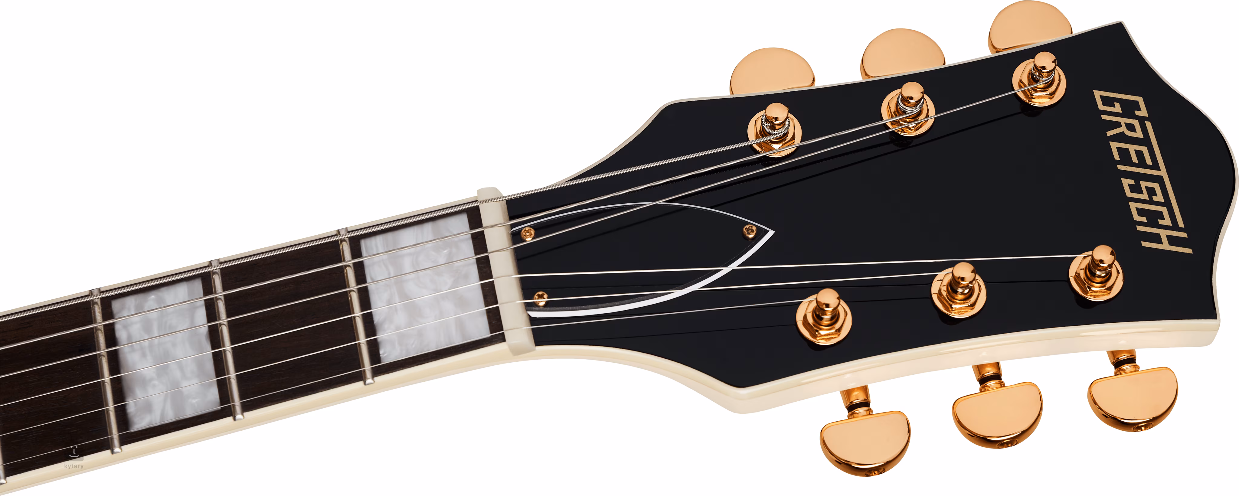 Struny sú ukotvené cez kostnú maticu v liatinových ladiacich mechanikách spoločnosti a cez mostík Adjusto-Matic v licencovanom tremole Bigsby B70. Klasický, pútavý dizajn gitár Gretsch podčiarkuje rad štýlových prvkov, od vyklenutého tela s F-otvormi, elegantným lemovaním, zlatým hardvérom až po čierny trojvrstvový pickguard so zlatým logom Gretsch.