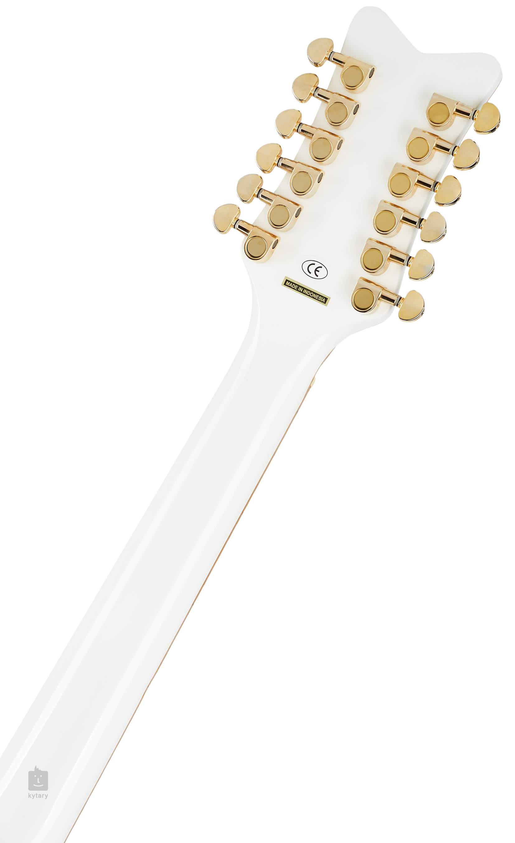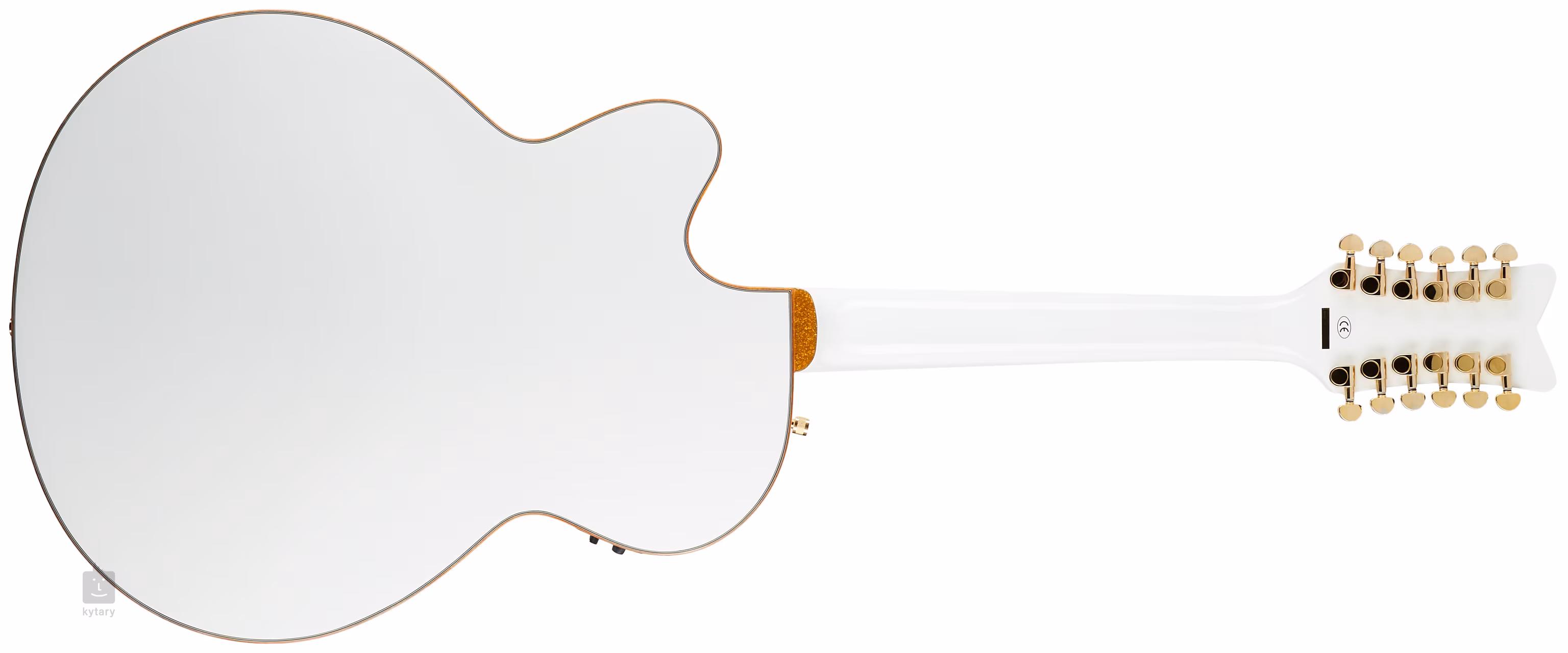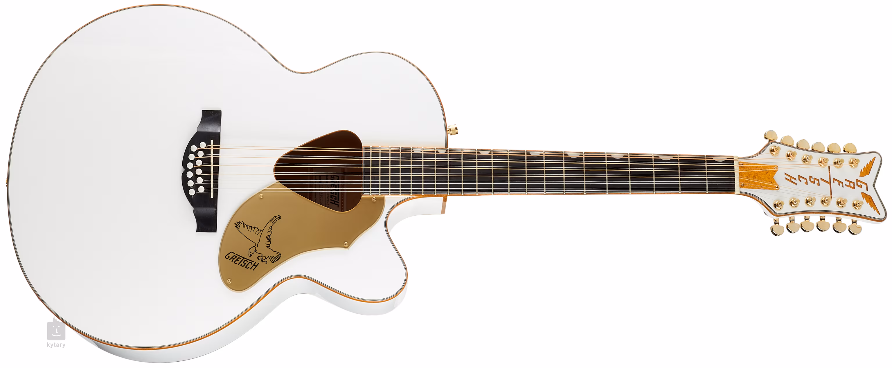 Dvanásťstrunová elektroakustická gitara G5022CWFE-12 Rancher Falcon WHT s veľkým jumbo telom vám ponúka bohatý, plný zvuk a estetiku dvanásťstrunových modelov Gretsch Falcon. Predná doska gitary je vyrobená z masívneho smrekového dreva, zatiaľ čo zadná doska a luby sú z laminovaného javora. Rezonanciu vrchnej dosky podporuje redukované rebrovanie typu X.