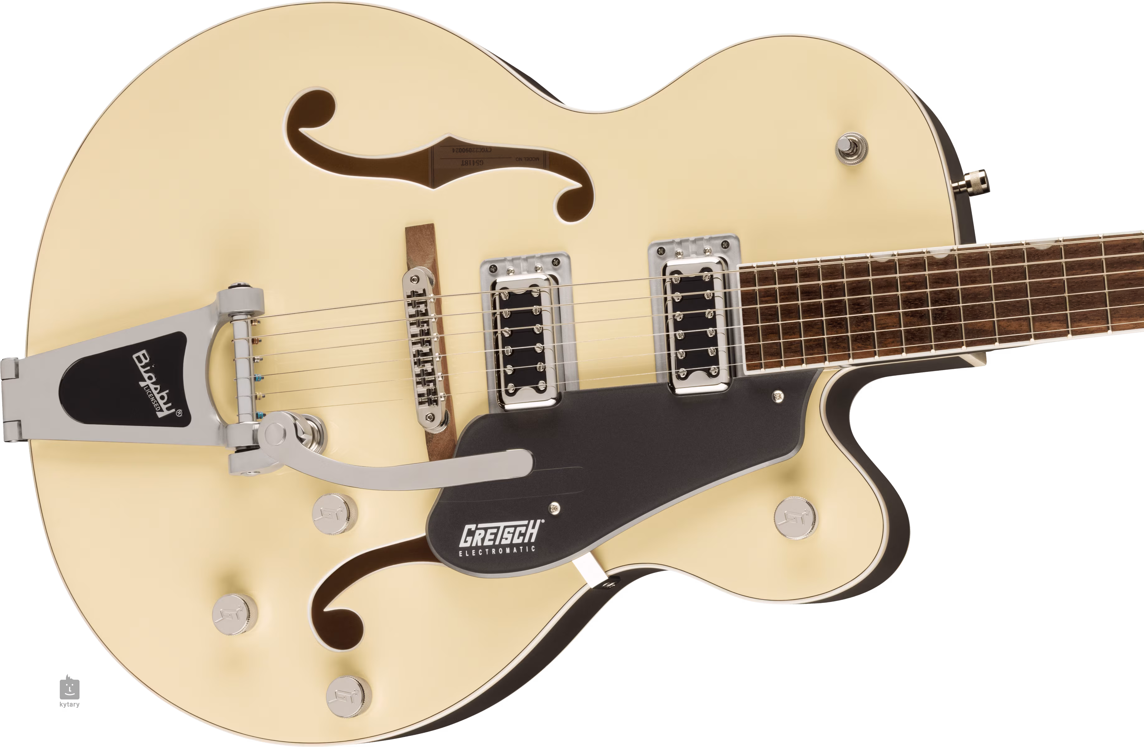 Struny sú ukotvené prostredníctvom nultého pražca Graphtech NuBone v otvorených ladiacich mechanikách vo vintage štýle a kobylky Adjusto-Matic osadenej na drevenej základni v licencovanom tremole Bigsby B60. Štýlový dizajn gitary podčiarkuje farebná schéma Two-Tone Vintage White/London Grey, lemovanie tela a hlavy, pickguard London Grey s bielym logom Gretsch a niklový hardvér.