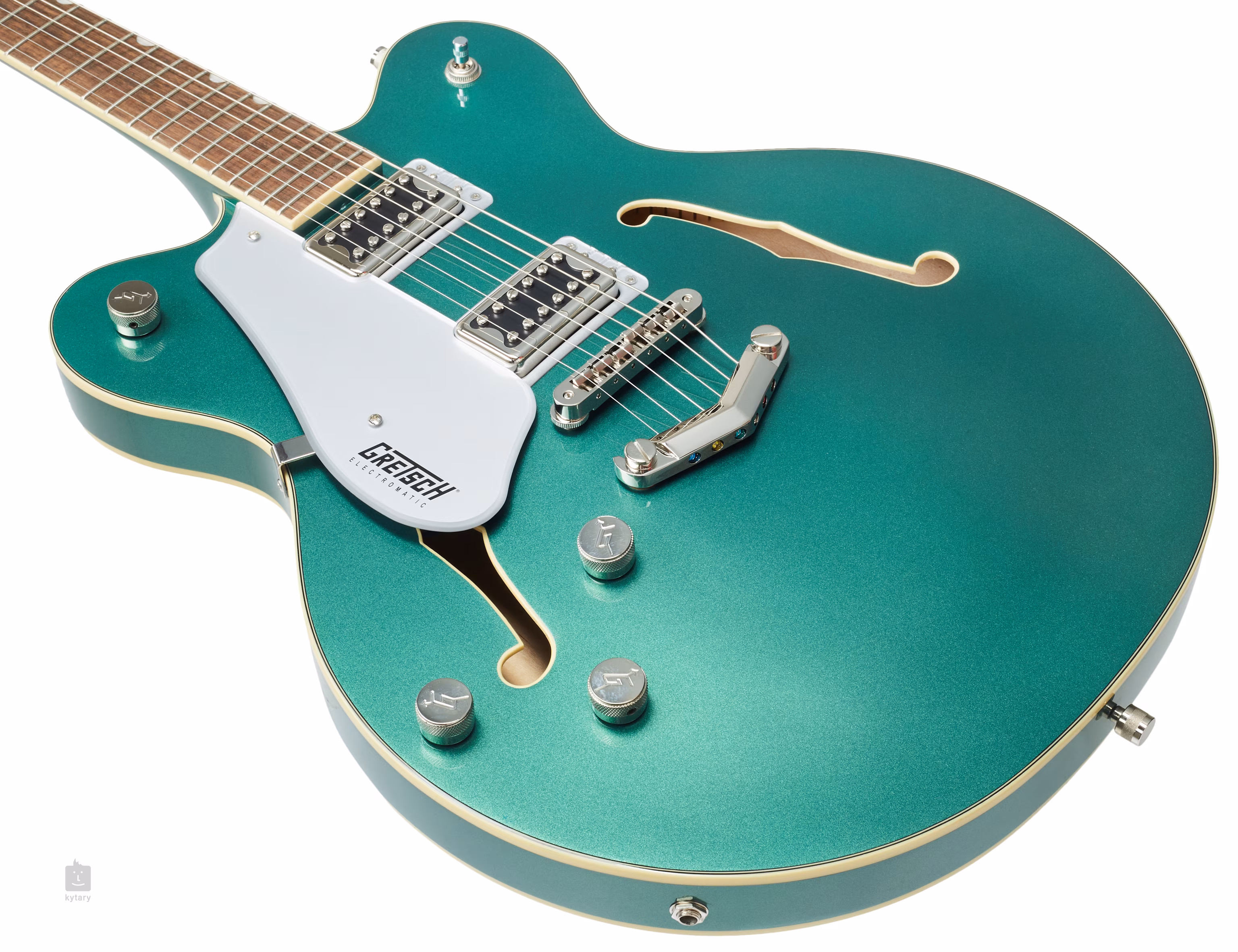 Presné ladenie zaručuje uchytenie strún prostredníctvom nultého pražca Graph Tech NuBone vo firemných Die-Cast ladiacich mechanikách a prostredníctvom kobylky Adjusto-Matic vo V-Stoptail. Štýlový dizajn gitary podčiarkujú tradičné prvky v podobe väzby tela v bielej farbe Aged White, niklového hardvéru a strieborného plexi pickguardu s čiernym logom Gretsch.