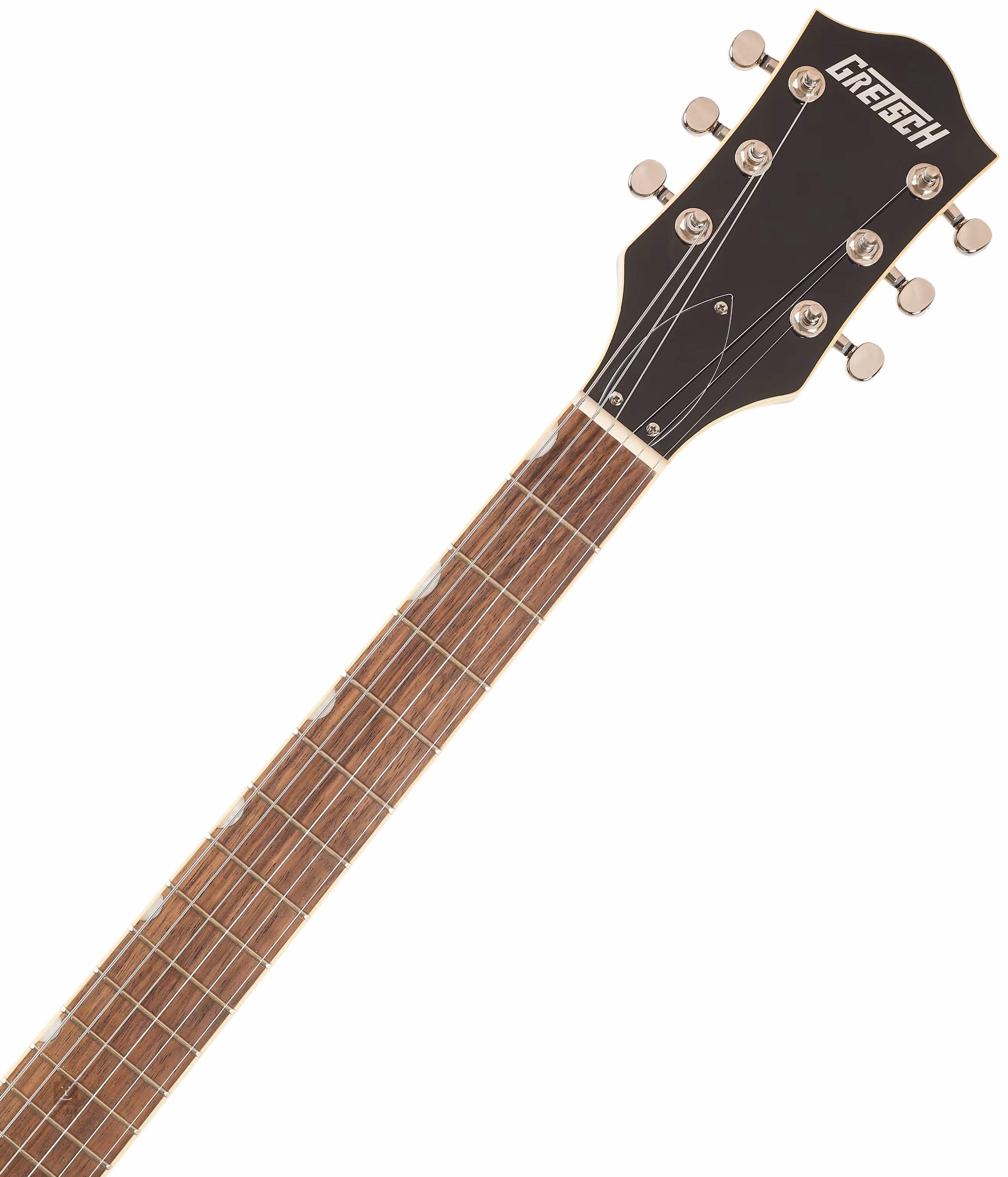 Presné ladenie zaručuje uchytenie strún prostredníctvom nultého pražca Graph Tech NuBone vo firemných Die-Cast ladiacich mechanikách a prostredníctvom kobylky Adjusto-Matic v licenčnom tremole Bigsby B70. Štýlový dizajn gitary podčiarkujú tradičné prvky v podobe väzby tela v bielej farbe Aged White, niklového hardvéru a pickguardu Gold Plexi s čiernym firemným logom Gretsch.