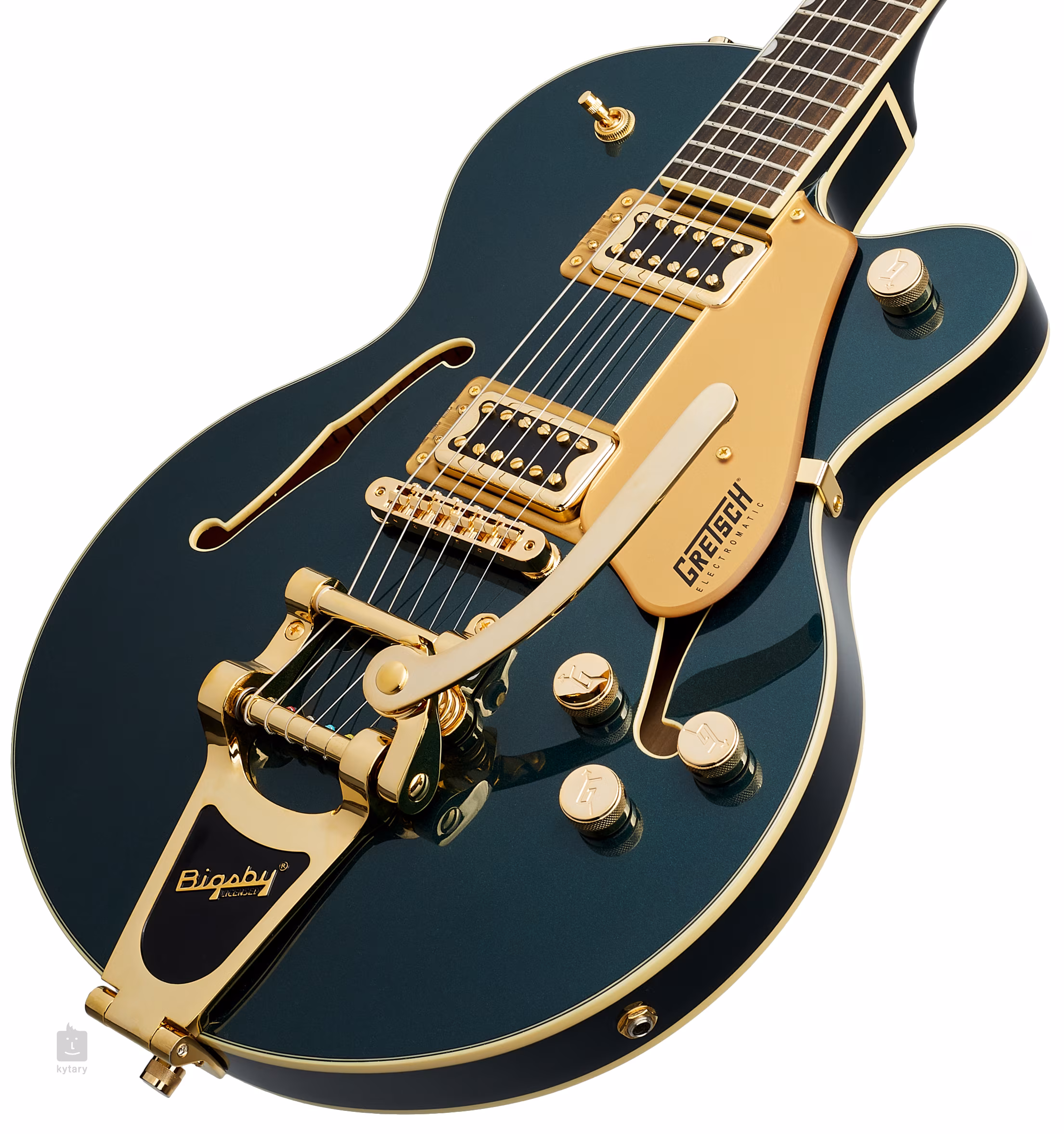 Presné ladenie zaručuje uchytenie strún prostredníctvom nultého pražca z umelej kosti vo firemných ladiacich mechanikách Die-Cast a v kobylke Adjusto-Matic osadenej na pevnej drevenej základni. Licencované tremolo Bigsby B70 dodáva vašej hre jemné zvukové efekty. Klasický oku lahodiaci dizajn gitár Gretsch podčiarkuje množstvo štýlových prvkov - od oblúkovitej konštrukcie tela, elegantnej väzby s jemným nádychom patiny (Aged White) a čierno-bielej kobylky, lesklého zlatého hardvéru až po kobylku Gold Plexi s čiernym logom spoločnosti Gretsch.