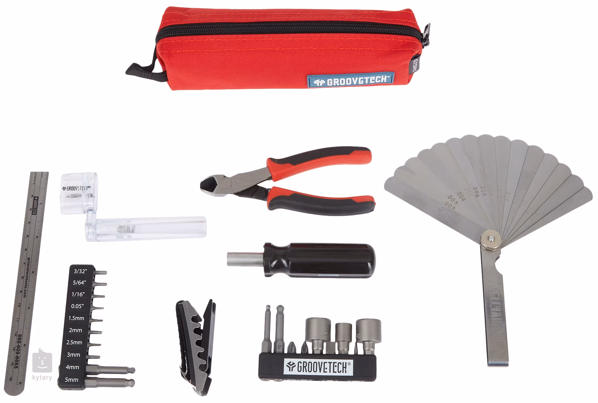 Hlavným prvkom je magnetická sada devätnástich bitov s ergonomicky tvarovanou rukoväťou, ktorá si poradí s akoukoľvek značkou gitary alebo basgitary. Jednoducho nastavte mostík, tremolo alebo výstuhu krku. Na nastavenie ladenia použite priložený kapodaster a sadu meradiel rozstupu strún a pražcov s integrovaným pravítkom. Súčasťou balenia sú aj rezačky strún a navíjacia kľučka a všetky nástroje sú dodávané v kompaktnej cestovnej taške.