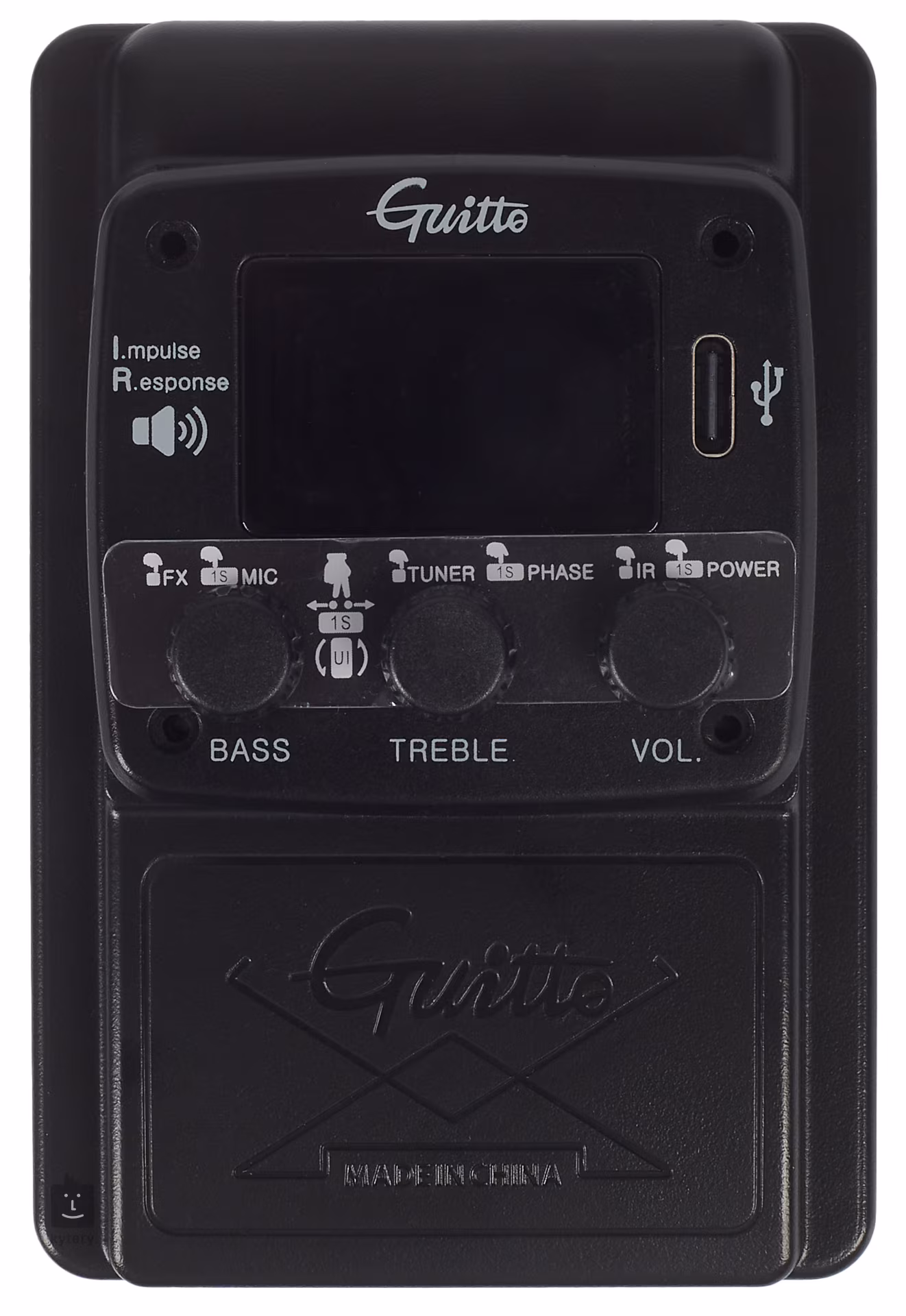 Guitto GGP-04 IR Resonance Pickup ponúka päť vstavaných IR profilov vrátane typov korpusov, ako sú Dreadnought a Auditorium, možnosť nahradiť vstavané IR vlastnými (WAV, 24-bit/44,1 kHz, dĺžka vzorky 1024 pts) a efekty delay a reverb vďaka vibračnej jednotke.