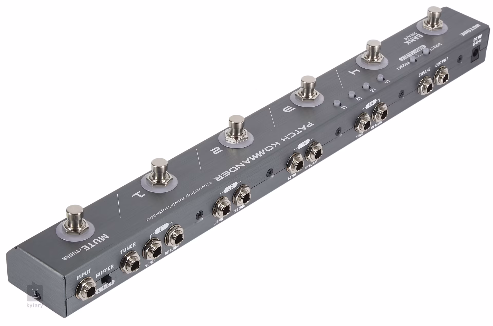 Patch Kommander je ľahký programovateľný nožný spínač od čínskej značky Hotone, ktorý vám pomôže skoncovať s chaosom vo vašom rastúcom pedalboarde. Je vybavený štyrmi samostatnými true bypass efektovými slučkami, do ktorých môžete podľa potreby umiestniť svoje pedálové efekty, prepínateľným vstupným bufferom, prepínačom Mute/Tuner a výstupom ladičky pre tiché ladenie medzi skladbami, prepínačom SW A/B pre prepínanie medzi kanálmi zosilňovača/komba a dvoma prevádzkovými režimami - Direct pre bežnú prevádzku a Preset s dvanástimi programovateľnými presetmi.