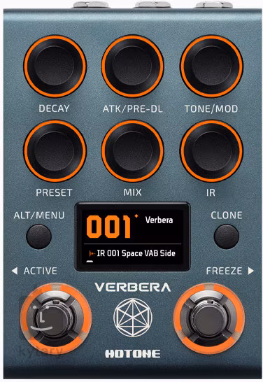 Pedál Hotone Verbera je duální digitální reverb utržený ze řetězu, který v sobě spojuje dva reverbové enginy, které můžete vzájemně míchat a vytvářet zcela nové kombinace zvuků. Tento mechanismus se nazývá konvoluce a poskytuje nevídané kreativní možnosti – spojte dva reverby do jednoho a objevte zcela unikátní efekt! V jádru pedálu se skrývá 120 prémiových IR, s jejichž pomocí můžete začít okamžitě vytvářet nové sonické textury. Pokud vám však tovární presety nevystačí, efekt vám nabídne 1024 slotů pro nahrání vašich vlastních IR. Efekt disponuje také funkcí IR Cloning, která vám umožní klonovat reverb z jiných efektů a převést je do vlastní IR. Tato ohromná sonická flexibilita dělá z efektu Verbera dokonalý nástroj pro živá vystoupení i studiovou práci.