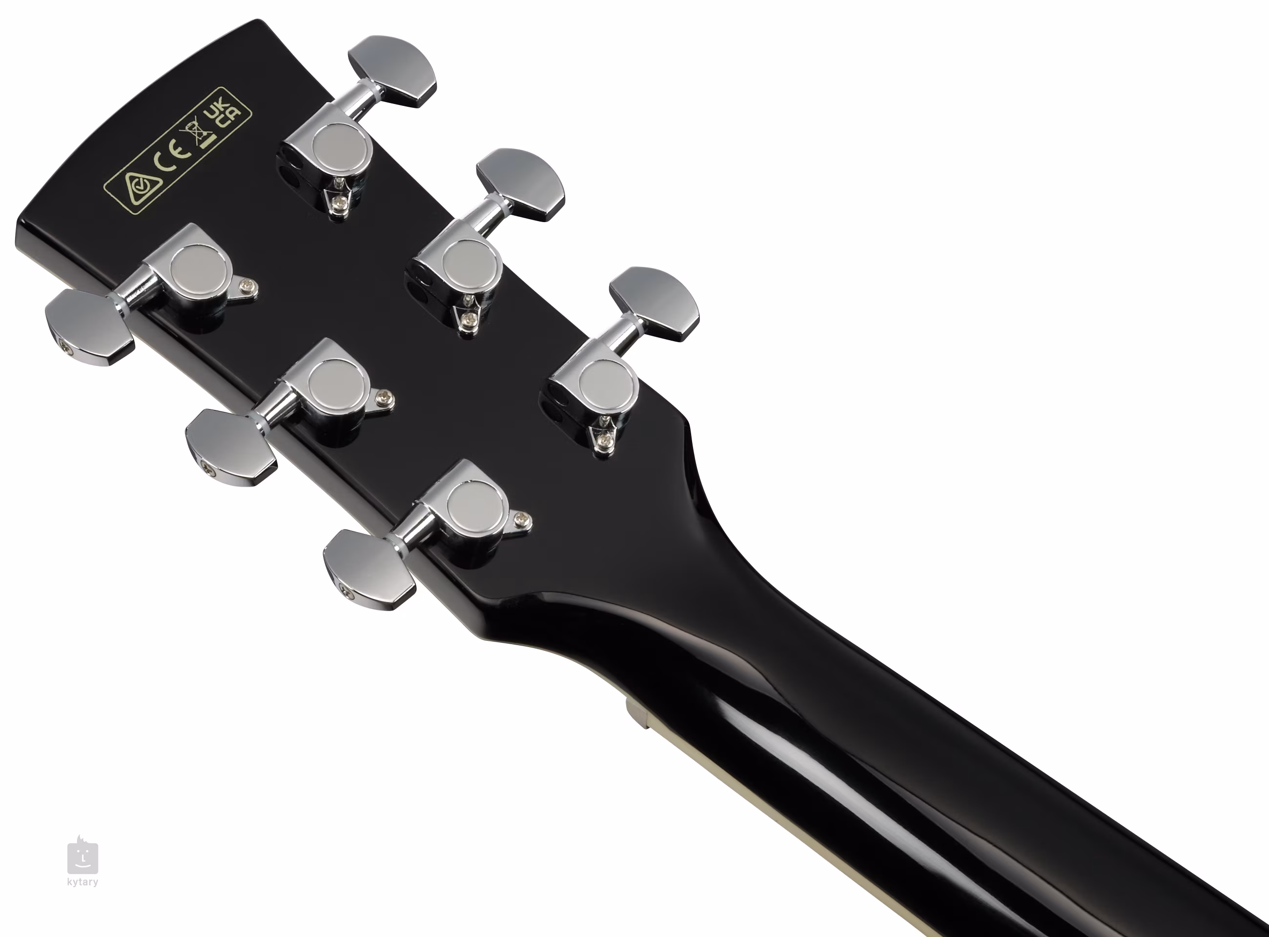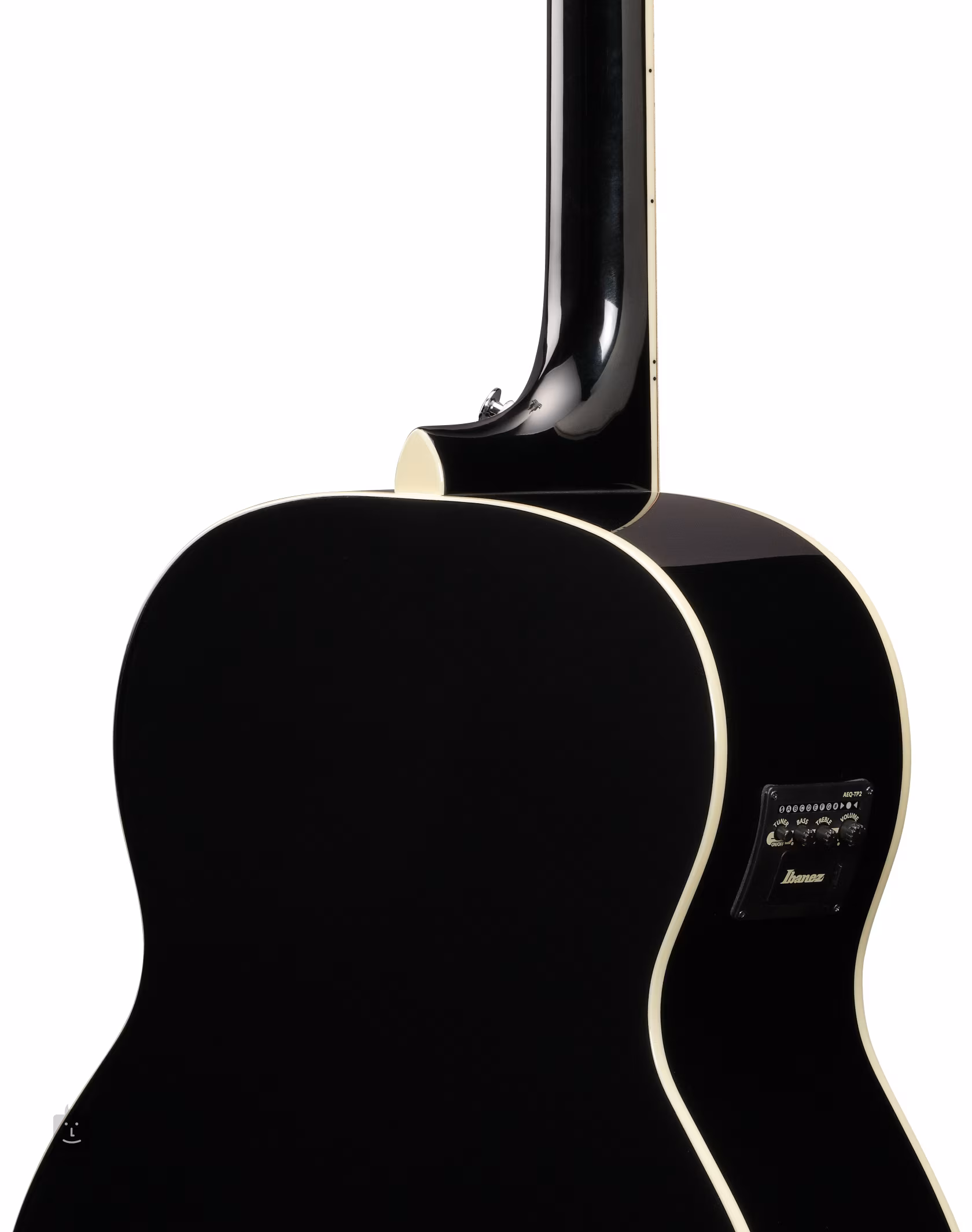 Ibanez AJ70M1E Black je elektroakustická gitara s masívnym jumbo telom a veľkým zvukom. Predná doska je vyrobená z masívneho smreka Sitka, zadná doska a luby sú z laminovaného okoumé. Ku krku z exotického dreva nyatoh je prilepený 20-pražcový figový hmatník. Orientáciu na hmatníku uľahčujú ozdobné polohové bloky z imitácie perlete.