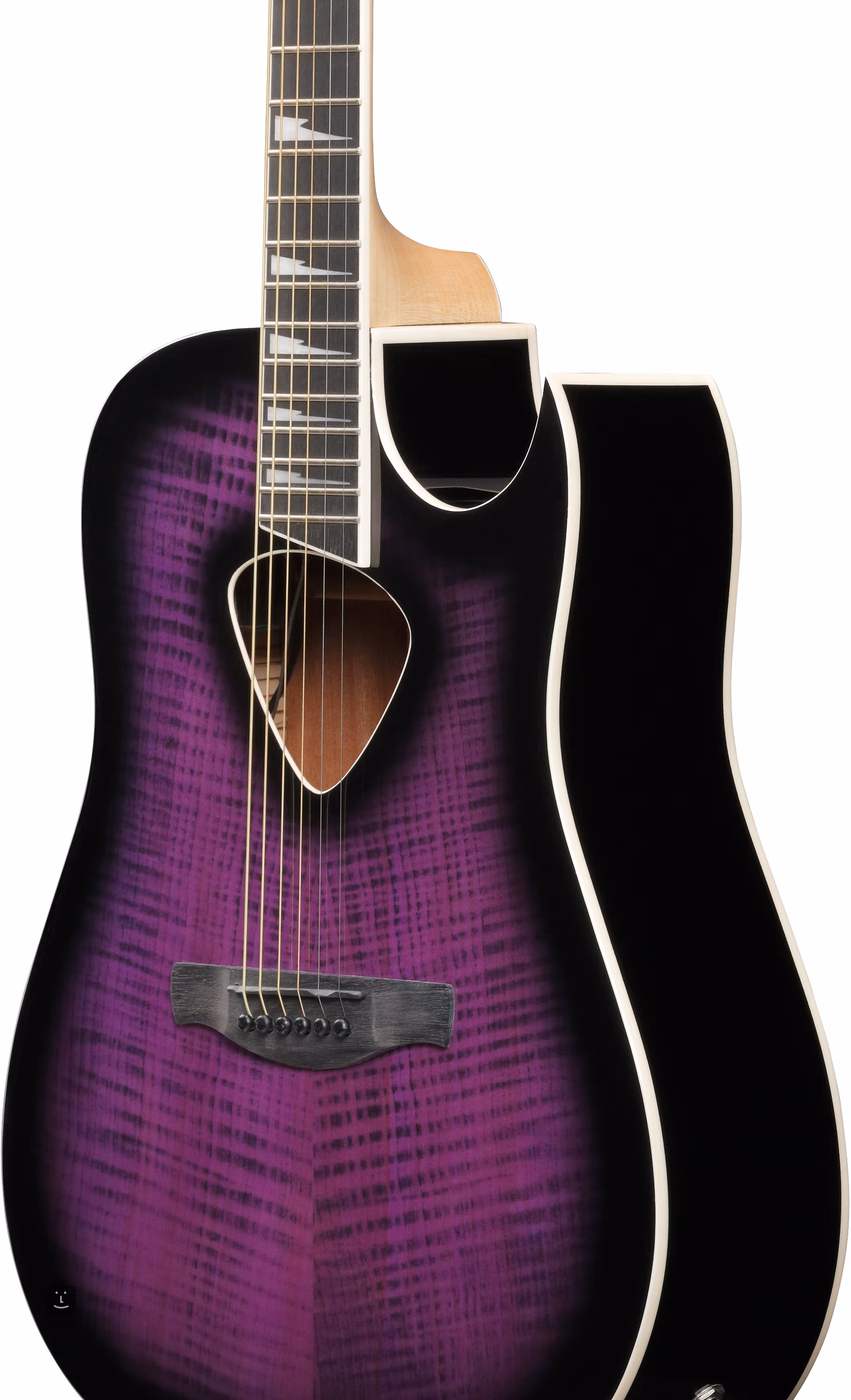 Elektroakustická gitara ALT50FA-TVT okamžite upúta pozornosť kombináciou vrchného dielu z plamenného javora, lesklého povrchu Transparent Violet Sunburst a prírodného vrstveného sapele na zadnej strane a bokoch. Javorový krk s pohodlným profilom Comfort Grip je vybavený hmatníkom z purpleheartu s dvadsiatimi dvoma pražcami. Pozícia značiek Sharktooth uľahčuje orientáciu na hmatníku.