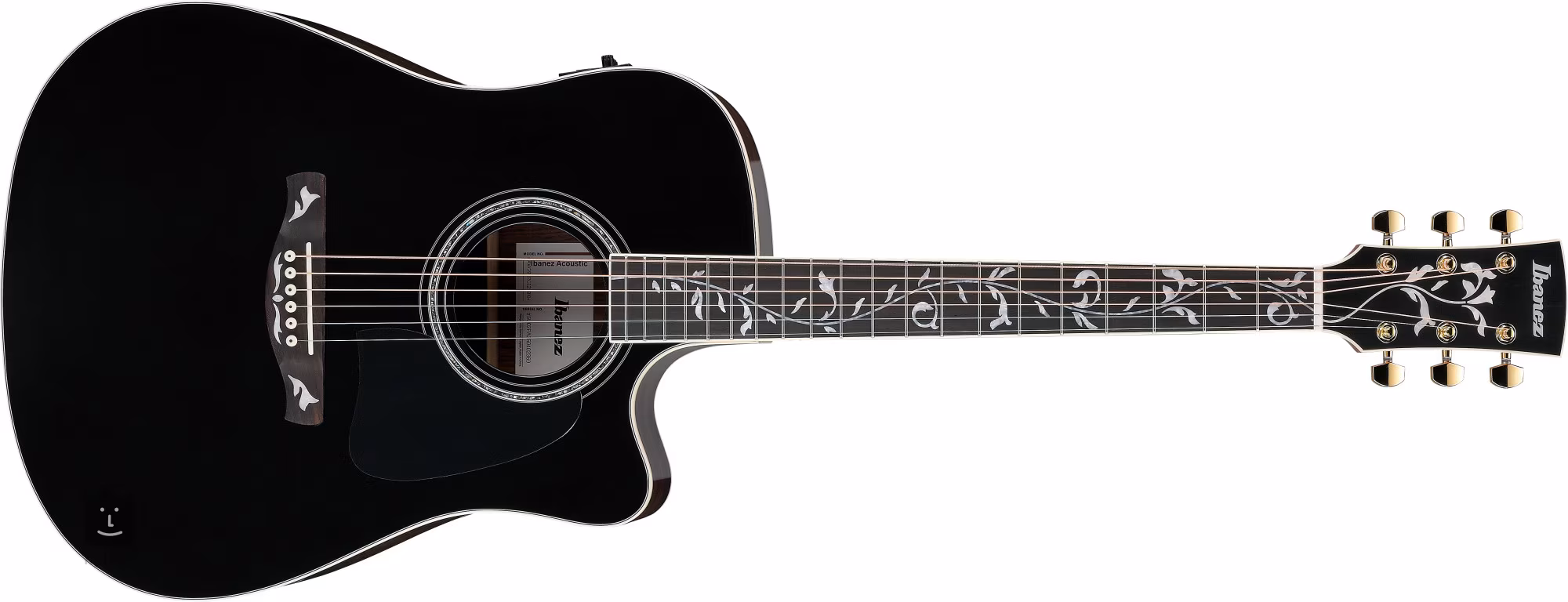 Predná doska elektroakustickej gitary Dreadnought AW391RCE Black Top je vyrobená z masívneho smreka Sitka, zatiaľ čo zadná doska a luby sú z laminovaného palisandru. Kresba palisandrového dreva je zvýraznená lesklou lakovou povrchovou úpravou. Ku krku z afrického mahagónu je prilepený palisandrový hmatník s 20 pražcami. Hmatník a hlavu zdobí intarzia Tree of Life známa zo signature modelov Steva Vaia a iných gitár Ibanez.
