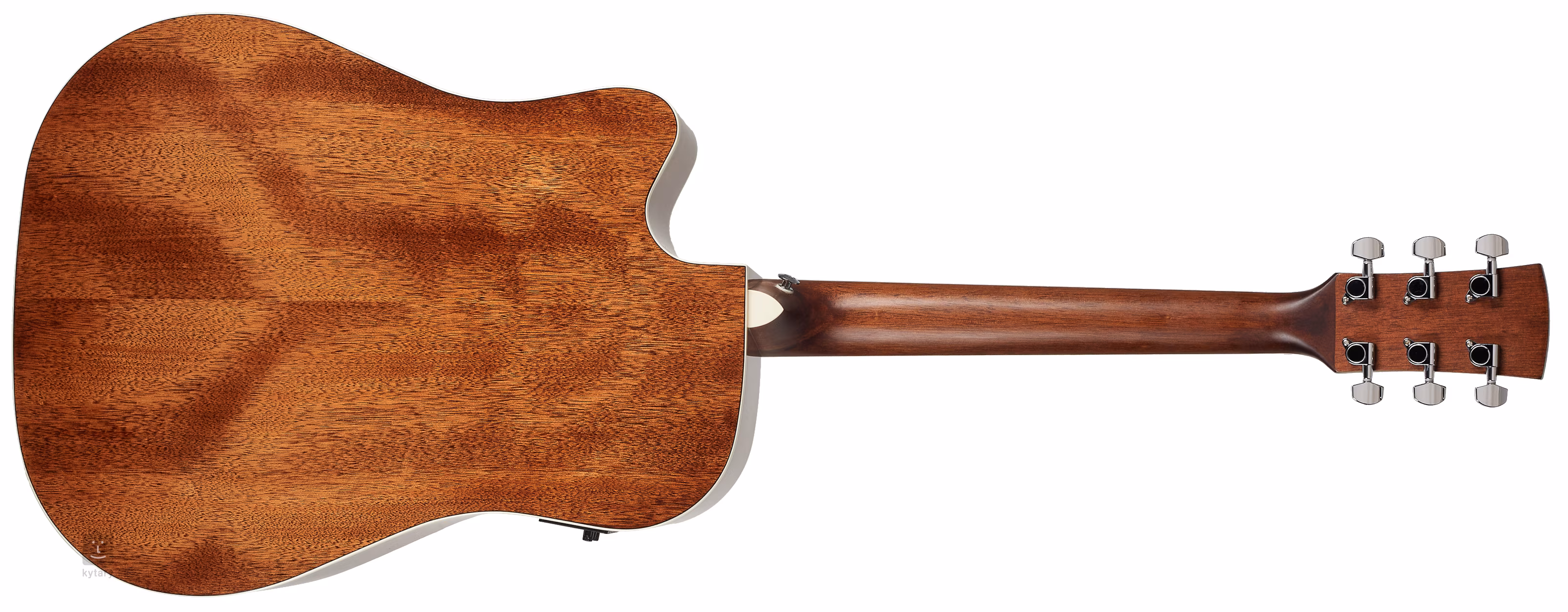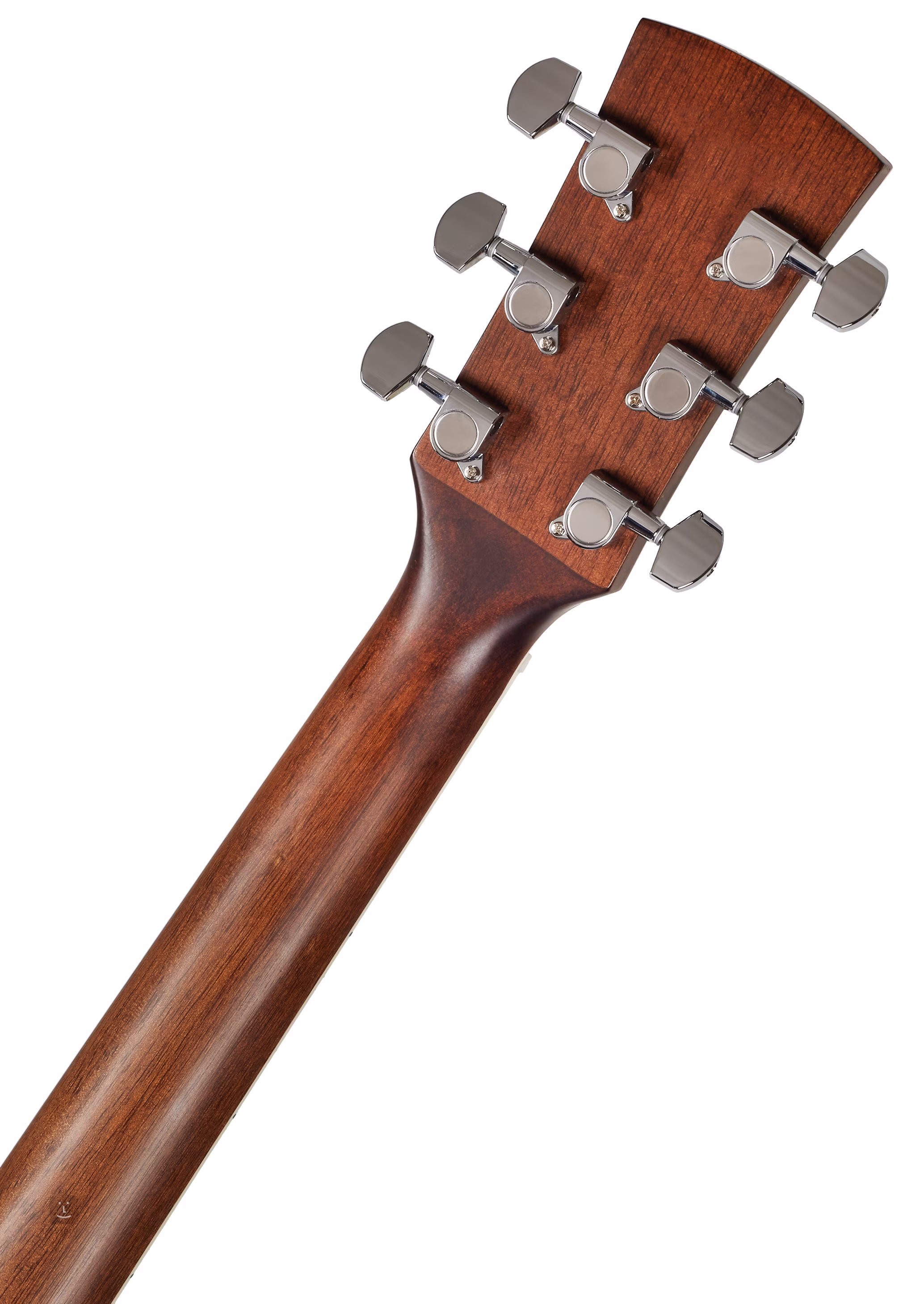 Predná doska Dreadnoughtu AW70ECE-NT je vyrobená z masívneho smreka Sitka, zatiaľ čo zadná doska a luby sú z preglejky okoumé. K exotickému krku z dreva nyatoh je prilepený 20-pražcový figový hmatník. Biele pozičné bodky uľahčujú orientáciu na hmatníku.
