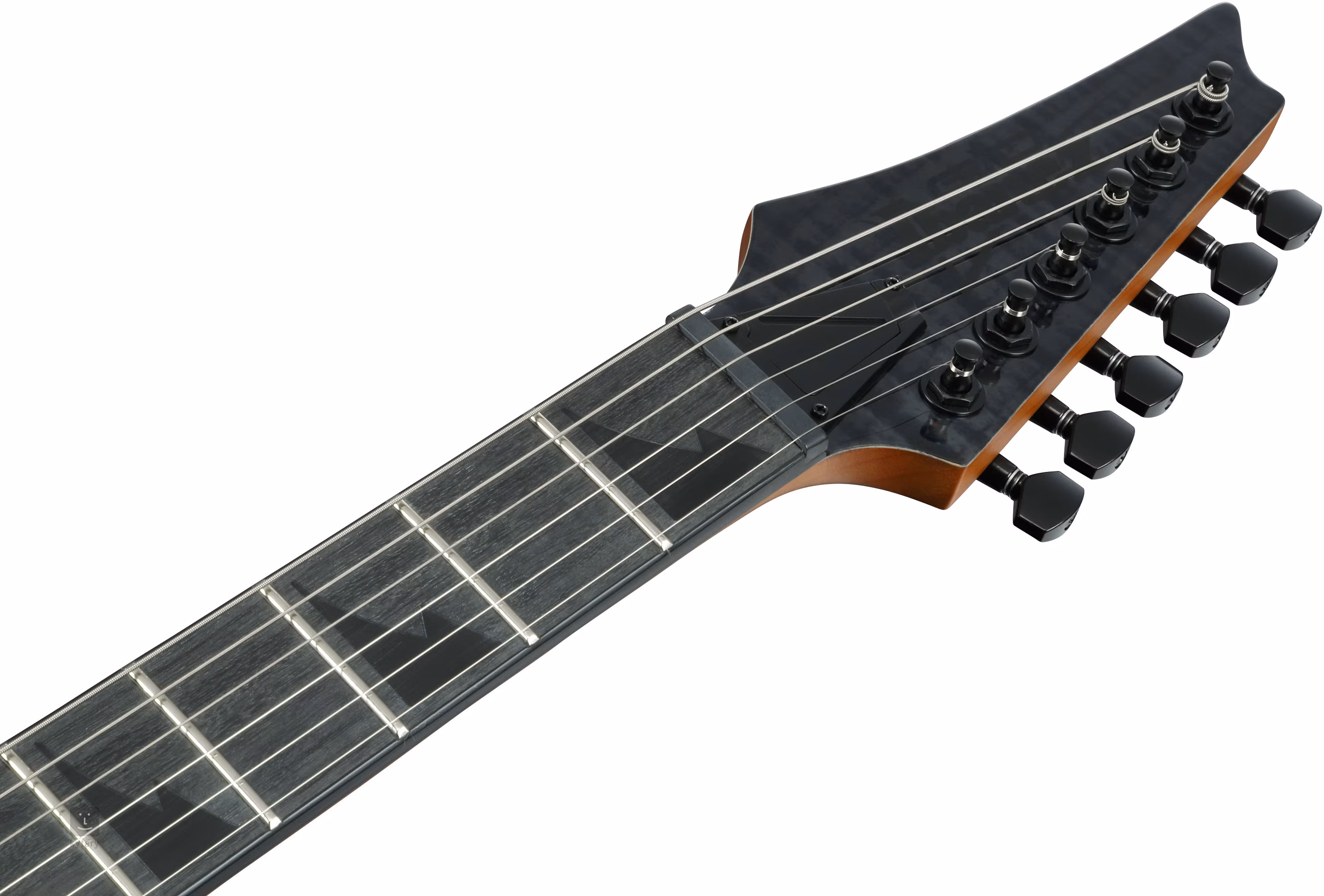 Telo z okoumé je zdobené lipovou dyhou s povrchovou úpravou v tvare plamenného javora a farebnou kombináciou Transparent Indigo Black. Krk z praženého javora je vybavený hmatníkom z purpleheartu s 24 jumbo pražcami. Pozícia značiek na hmatníku uľahčuje orientáciu.