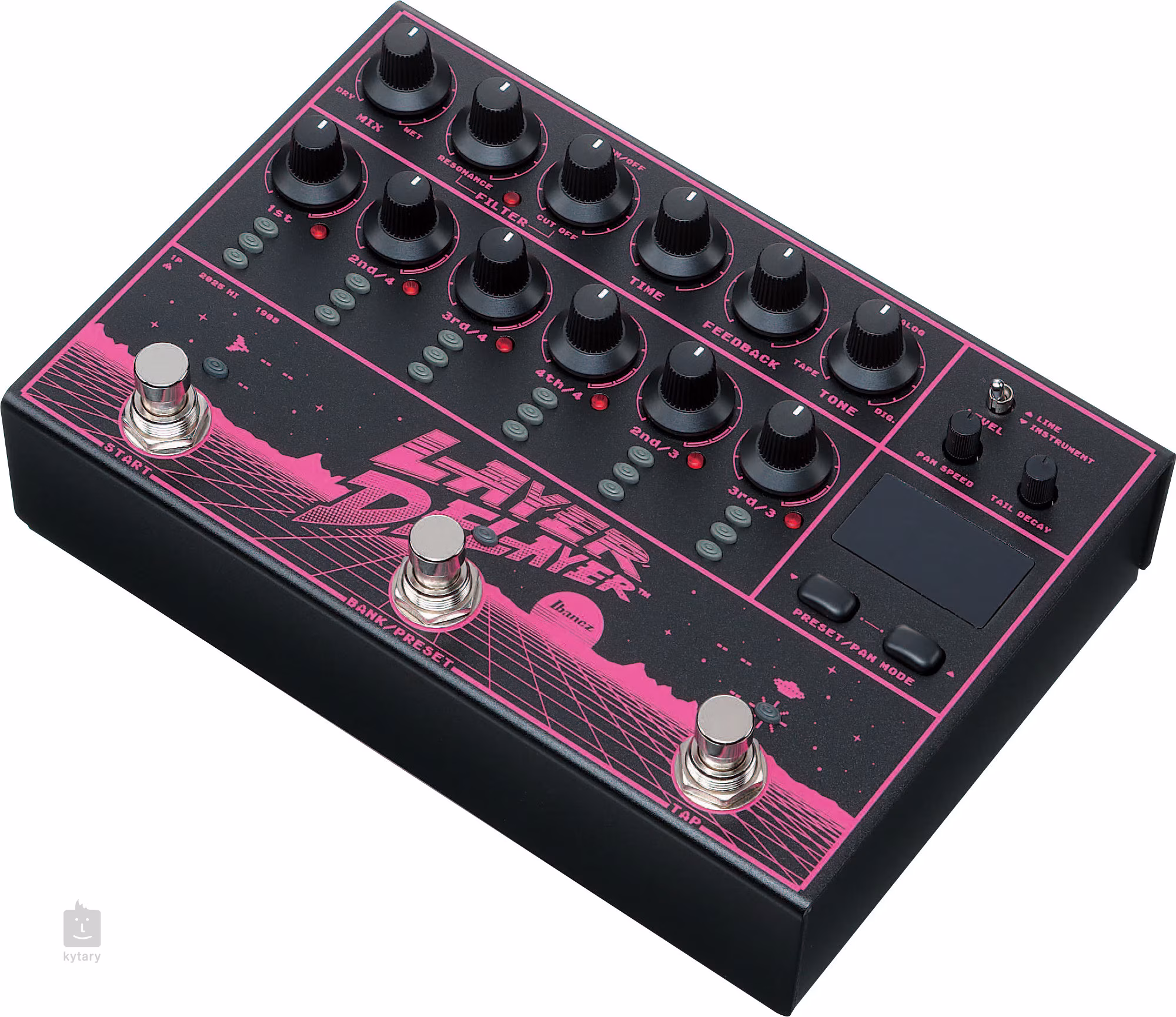 Pedálový prepínač slúži na zapnutie/vypnutie efektu, prechádzanie a ukladanie predvolieb (LD303 Layer Delayer ponúka 20 továrenských predvolieb a celkom 50 slotov pre predvoľby) a nastavenie efektu oneskorenia pomocou funkcie Tap Tempo. Dodatočné ovládače umožňujú nastaviť rýchlosť panorámovania signálu medzi reproduktormi v stereo režime a typ dozvuku alebo okamžité odrezanie efektu oneskorenia po vypnutí efektu (Trails). Samozrejme, k dispozícii je prepínač pre nástroje s nižším (Instrument) a vyšším (Line) výstupom.