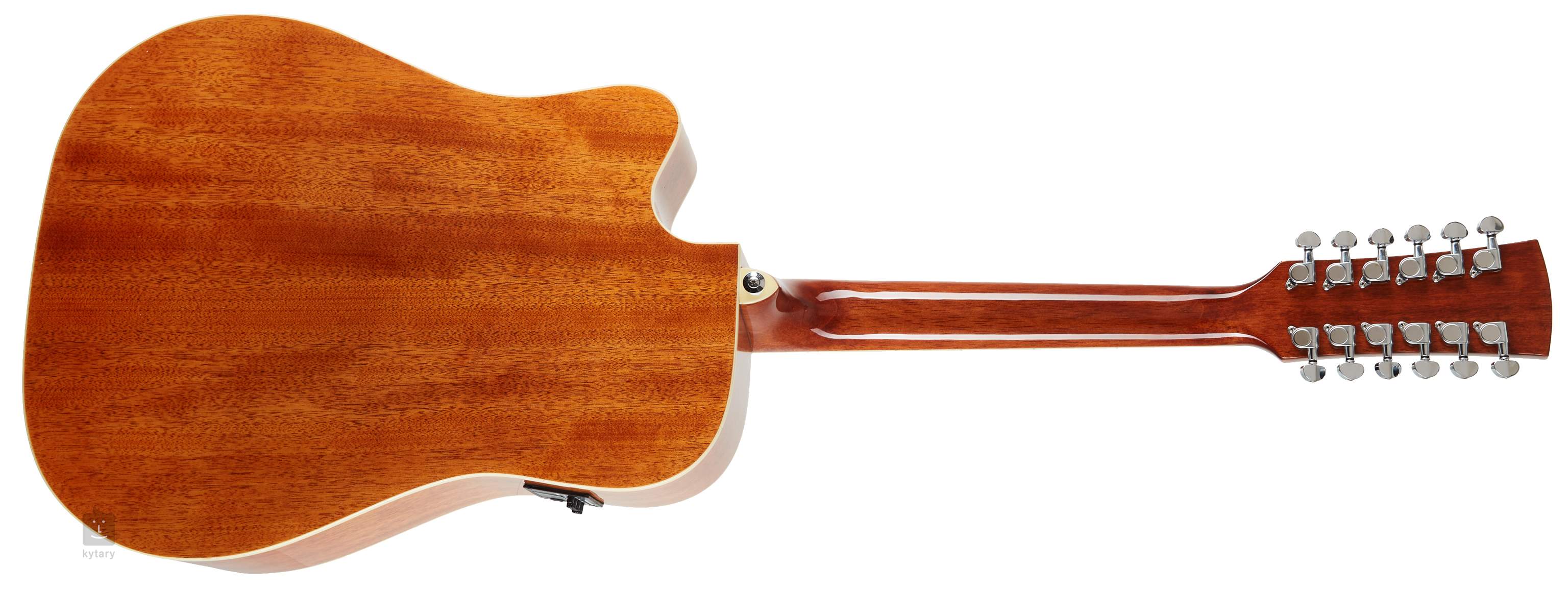 Laminované telo 12-strunovej kobylky Dreadnought PF1512ECE-NT je vyrobené zo smrekovej prednej dosky a zadnej dosky a lubov z okoumé. Ku krku z exotického dreva nyatoh je prilepený figový hmatník s dvadsiatimi pražcami. Biele polohové bodky uľahčujú orientáciu na povrchu hmatníka.