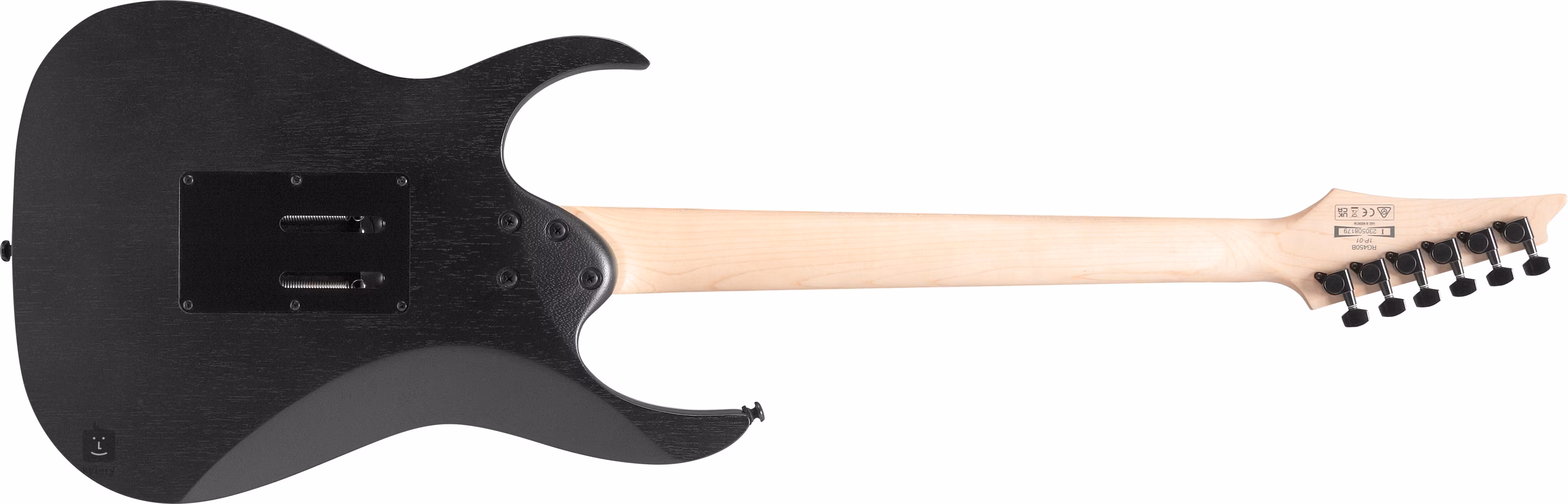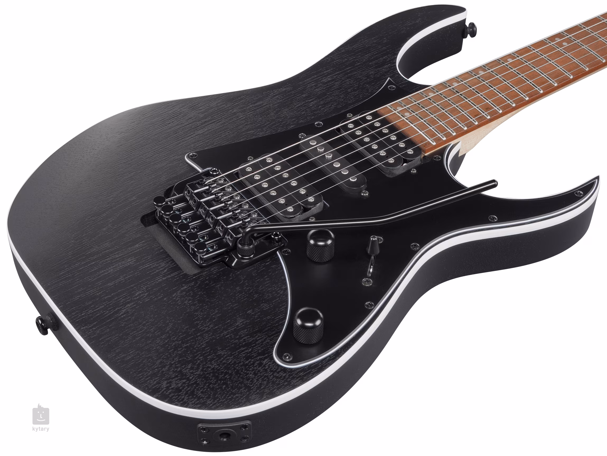 Telo RG450B Weathered Black je vyrobené z dreva meranti. Rýchly javorový krk s profilom Wizard III je prilepený k hmatníku z jatoby osadenému dvadsiatimi štyrmi pražcami veľkosti jumbo.