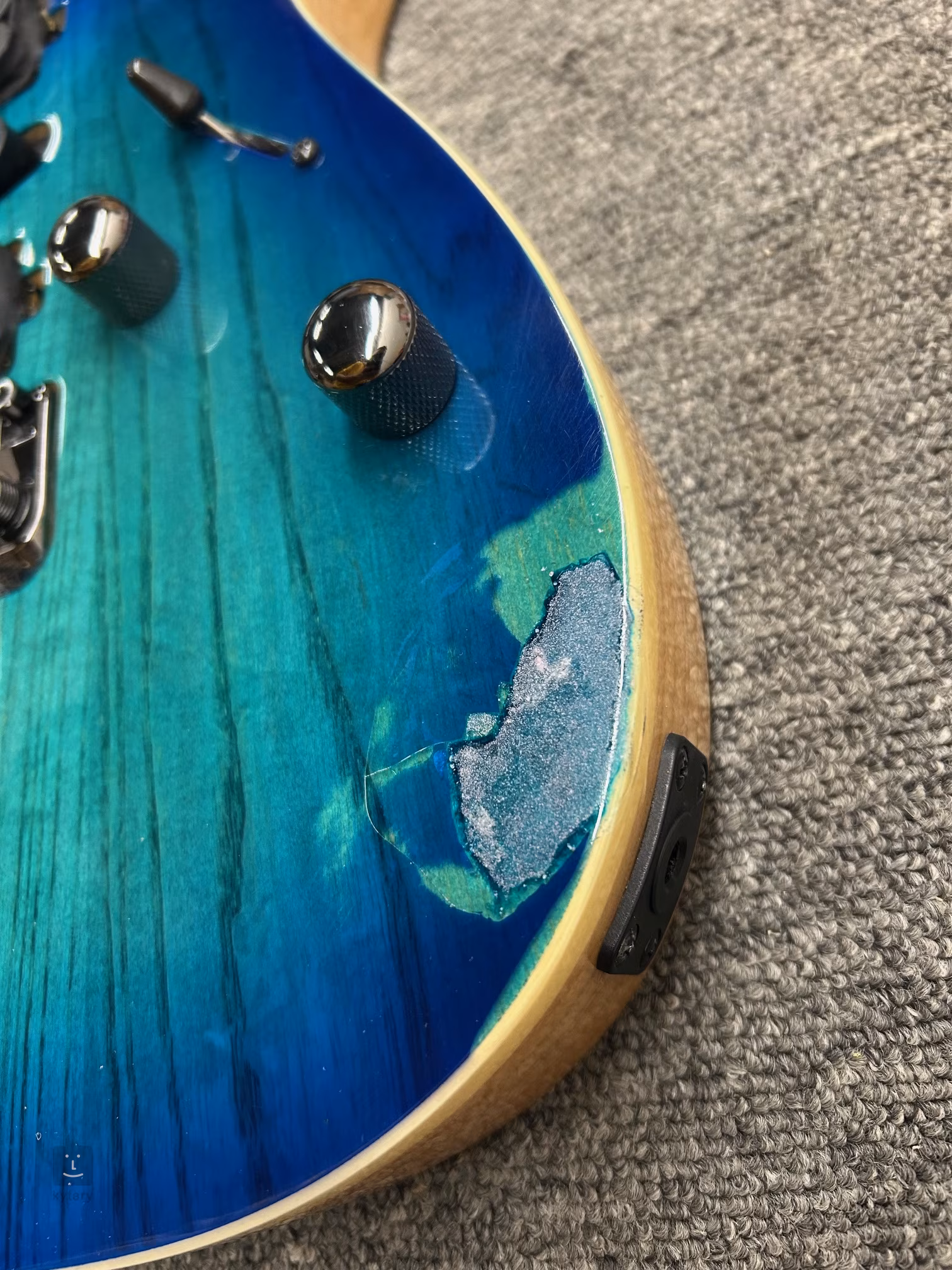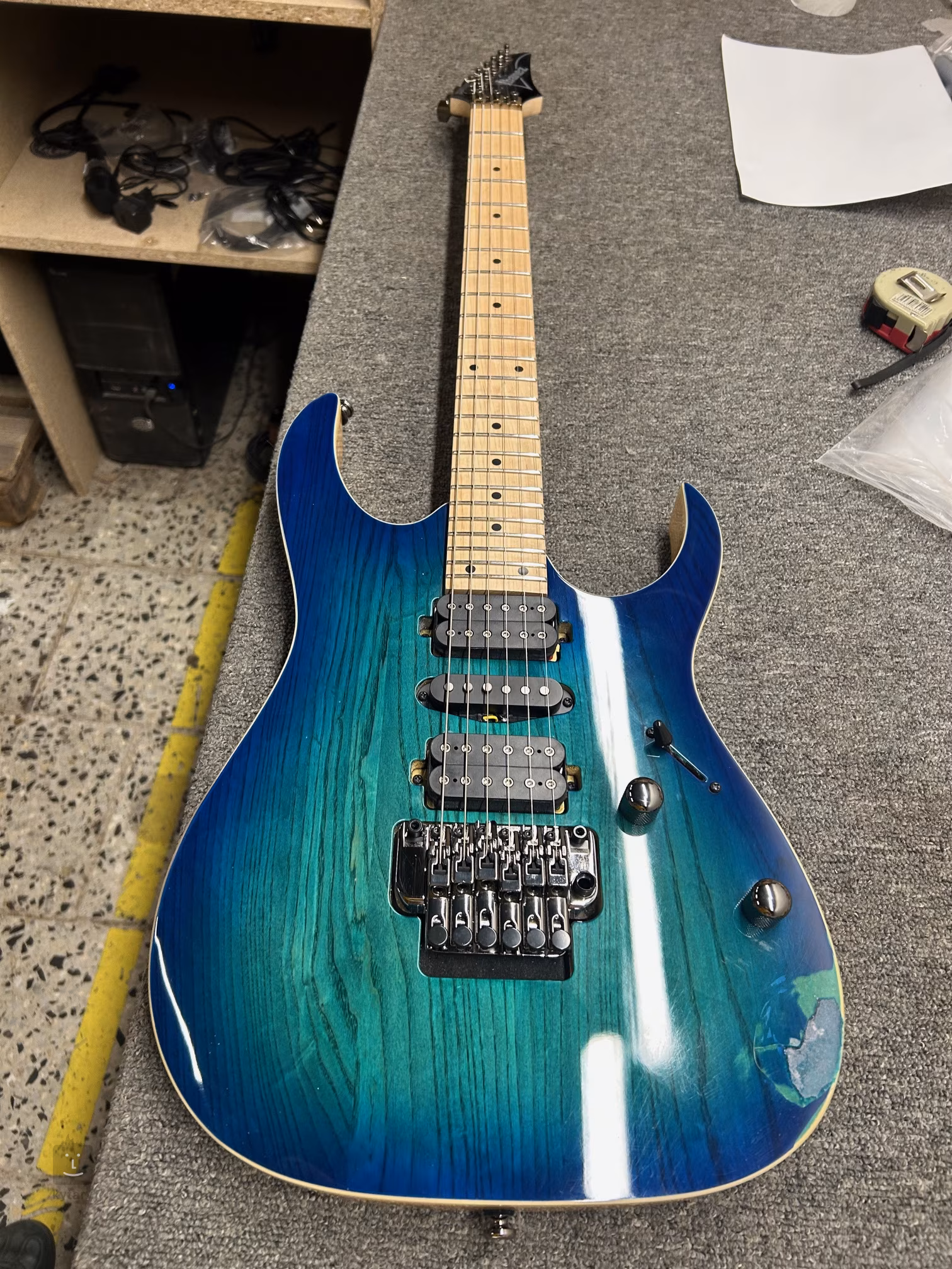 Jasanové telo modelu RG470AHM-BMT zdobí lesklá lakovaná povrchová úprava a farebná schéma Blue Moon Burst. Rýchly krk s profilom Wizard III a hmatník sú vyrobené z javora. Povrch hmatníka rozdeľuje dvadsaťštyri pražcov veľkosti jumbo a čierne polohové bodky.