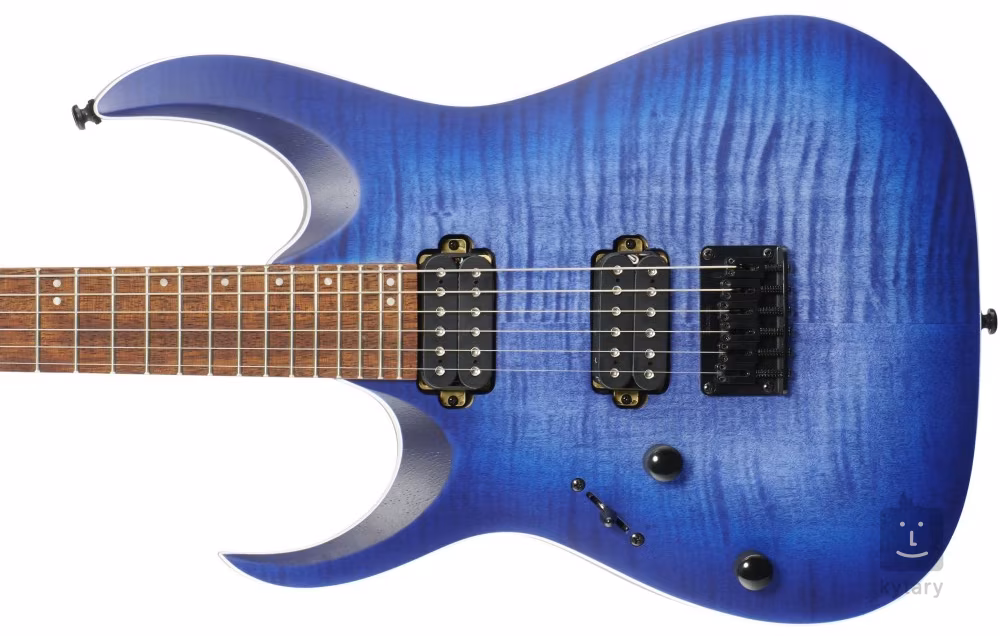Meranti telo ľavorukej gitary RGA42FML-BLF zdobí vrchná dyha z fládrovaného javora a povrchová úprava Blue Lagoon Burst Flat. Rýchly javorový krk s profilom Wizard III je prilepený k hmatníku z jatoby osadenému dvadsiatimi štyrmi pražcami veľkosti jumbo. Biele polohové bodky na hmatníku uľahčujú orientáciu.