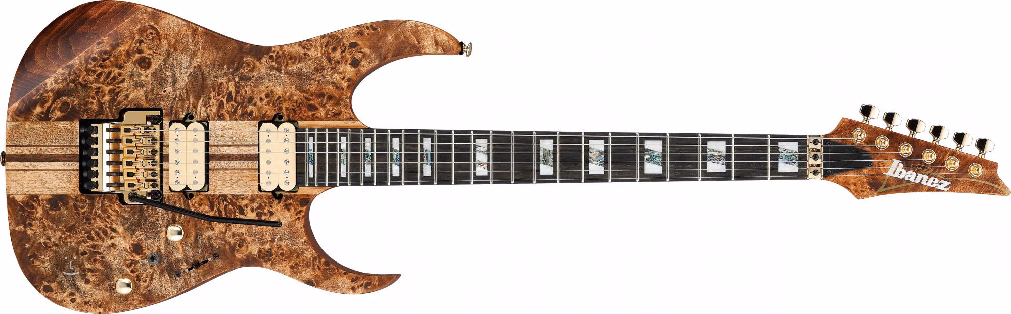 Lipové telo RGT1220PB-ABS zdobí efektná vrchná doska z topoľovej koreňovej dyhy, ktorej kresbu dreva zvýrazňuje povrchová úprava Antique Brown Stained Flat. Tenký priechodný krk s profilom Wizard III je zložený zo siedmich kusov javora a orecha. Plochu ebenového hmatníka rozdeľuje dvadsaťštyri pražcov z nehrdzavejúcej ocele veľkosti Jumbo. Zaoblené hrany nultého pražca vám poskytnú väčší komfort pri hraní (Premium fret edge treatment), zatiaľ čo orientáciu po hmatníku uľahčujú bloky s imitáciou perlete a pravej perlete (Abalone) a svietiace bodky po stranách.