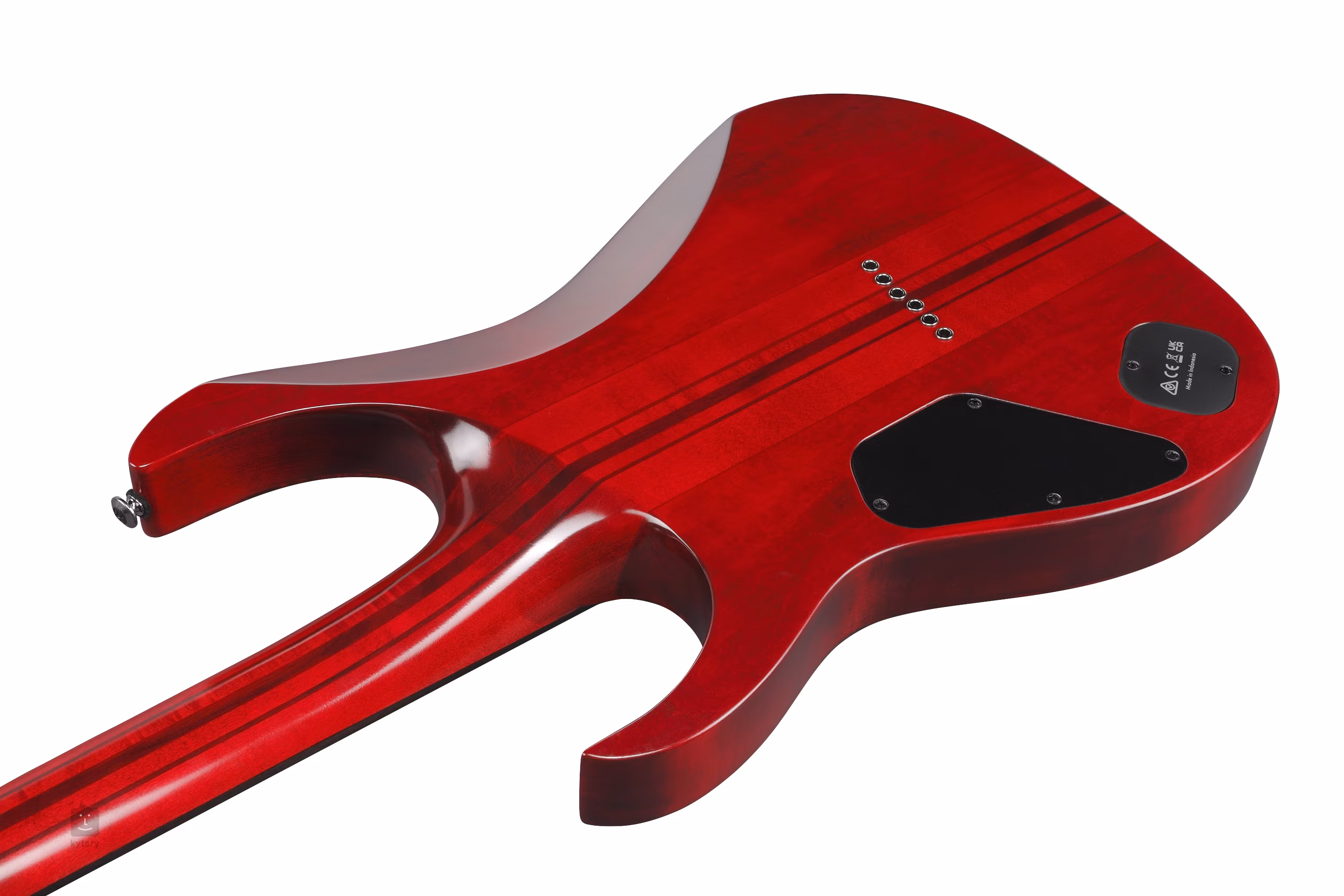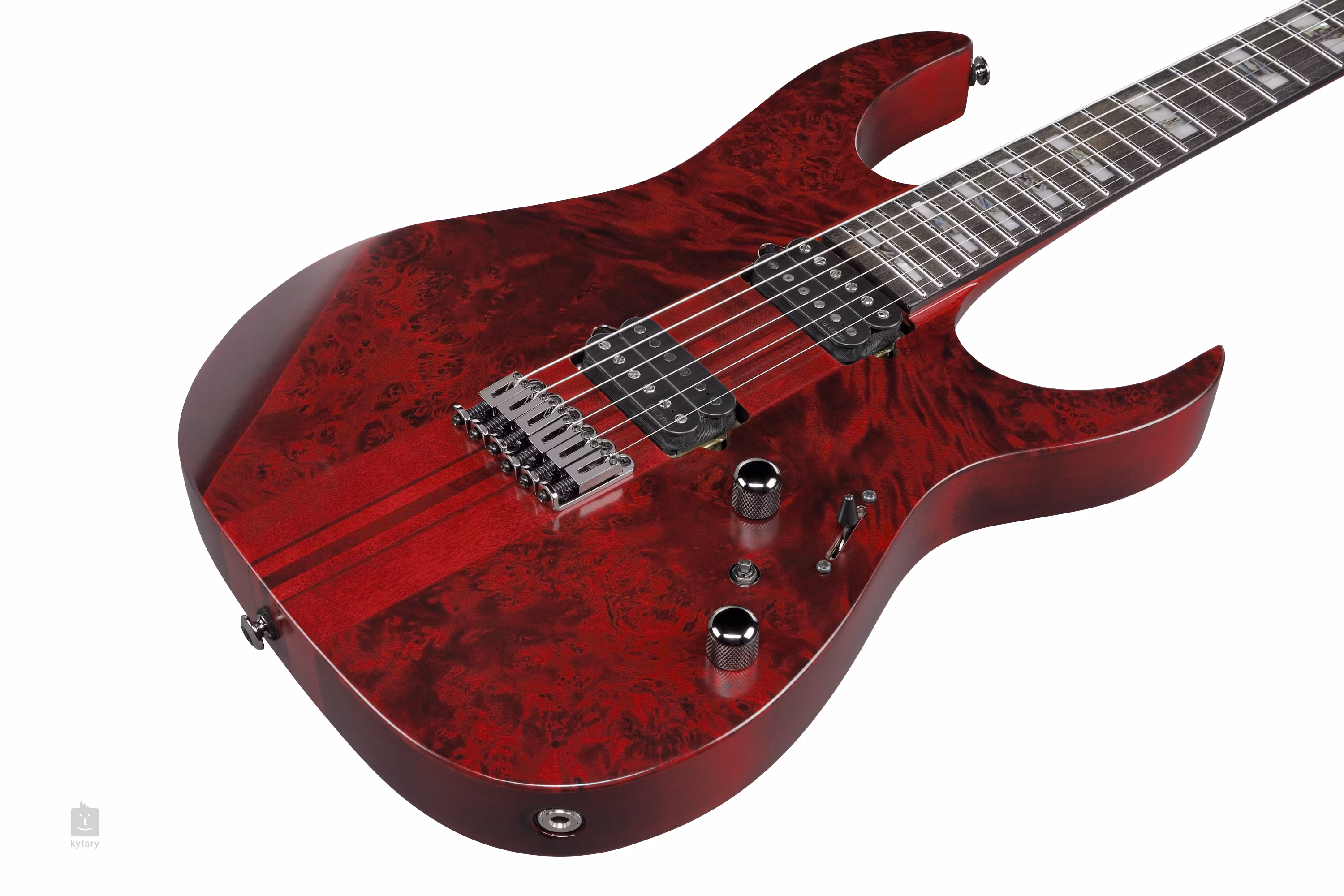Lipové telo RGT1221PB-SWL zdobí efektná vrchná doska s 3 mm hrubou topoľovou koreňovou dyhou a povrchová úprava Stained Wine Red Low Gloss. Tenký priechodný krk s profilom Wizard III je zložený zo siedmich kusov javora a orecha. Plochu ebenového hmatníka rozdeľuje dvadsaťštyri pražcov z nehrdzavejúcej ocele veľkosti Jumbo. Zaoblené hrany nultého pražca vám poskytnú väčší komfort pri hraní (Premium fret edge treatment), zatiaľ čo orientáciu po povrchu hmatníka uľahčujú bloky s imitáciou perlete a abalónu a luminiscenčné bodky po stranách.