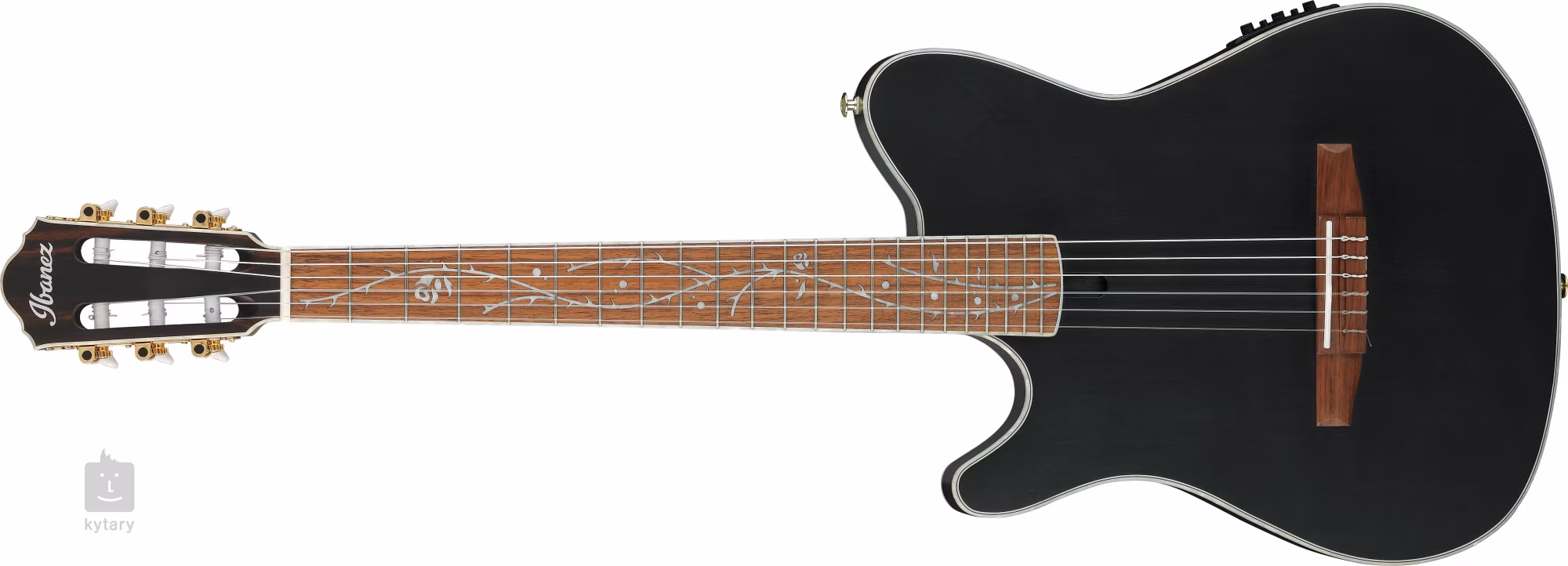 Krk z ňatohu je prilepený k orechovému hmatníku s dvadsiatimi dvoma pražcami. Struny sú ukotvené v hmatníku s tradičným dizajnom a orechovou kobylkou. Nádherné spracovanie podčiarkuje intarzia "Strom smrti" prebiehajúca po celej dĺžke hmatníka, imitácia perleťového lemovania tela a zlatý hardware,