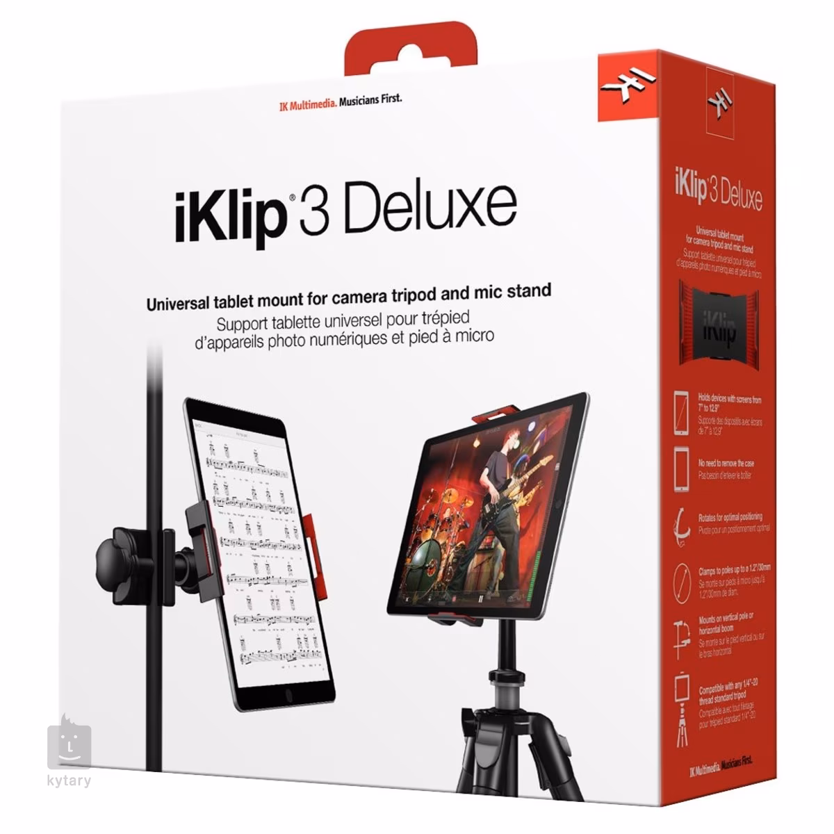 iKlip 3 Deluxe je profesionálny držiak vyvinutý špeciálne pre zariadenia iPad, vhodný pre hudobníkov, kameramanov, fotografov a kreatívcov, ktorí chcú mať maximálnu viditeľnosť a dokonalú viditeľnosť premietaného obrazu alebo textu. Držiak je univerzálny, takže ho môžete pripevniť k akémukoľvek stojanu na fotoaparát alebo mikrofón. Držiak je vyrobený z odolného plastu a kvalitnej gumy, aby zabezpečil maximálnu bezpečnosť vášho iPadu. iKlip 3 Deluxe sa dá otáčať o 360°, takže si vždy môžete nastaviť uhol s výbornou viditeľnosťou. Rozpätie držiaka je 160 mm až 230 mm, do ktorého sa zmestia zariadenia iPad s uhlopriečkou 7" až 12,9". Súčasťou balenia je adaptér UNC z 1/4"-20 na 5/8"-27 pre väčšiu flexibilitu držiaka a dvojica adaptérov na pripevnenie k stojanu kamery alebo mikrofónu.