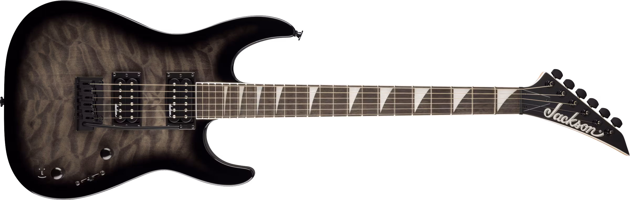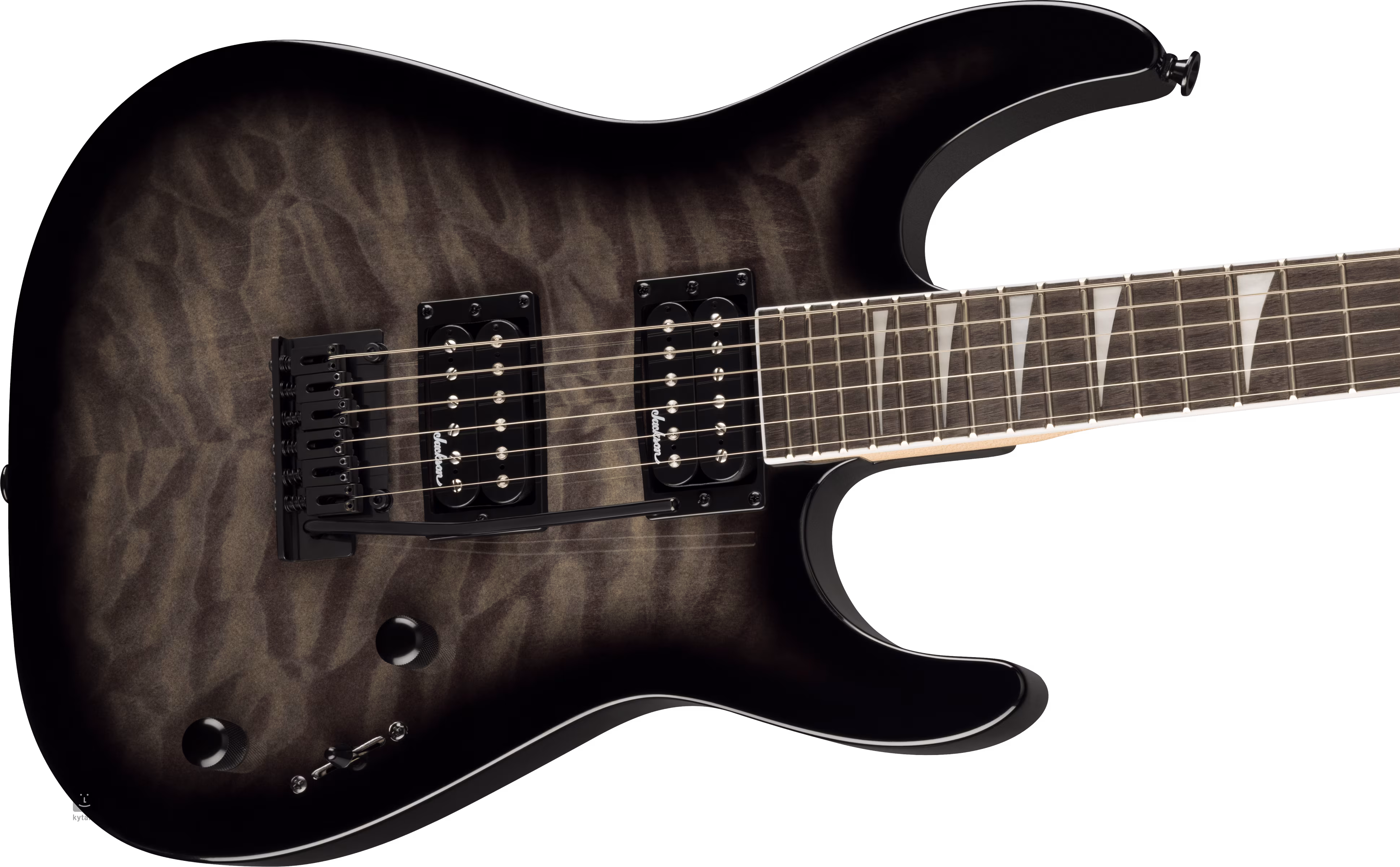 Topoľové telo gitary JS SERIES JS20 DKQ 2PT - TR BLK je zdobené dizajnom/potlačou obláčikového javora. Skrutkovaný javorový krk s grafitovou výstuhou je prilepený k amarantovému (purpleheart) hmatníku osadenému dvadsiatimi štyrmi pražcami veľkosti jumbo. Jeho rádius sa smerom k telu splošťuje - umožňuje tak pohodlné riffovanie pri nultom pražci, ako aj pohodlný ultra rýchly shred vo vyšších polohách. Pozičné značky z imitácie perlete Sharkfin uľahčujú orientáciu na hmatníku.