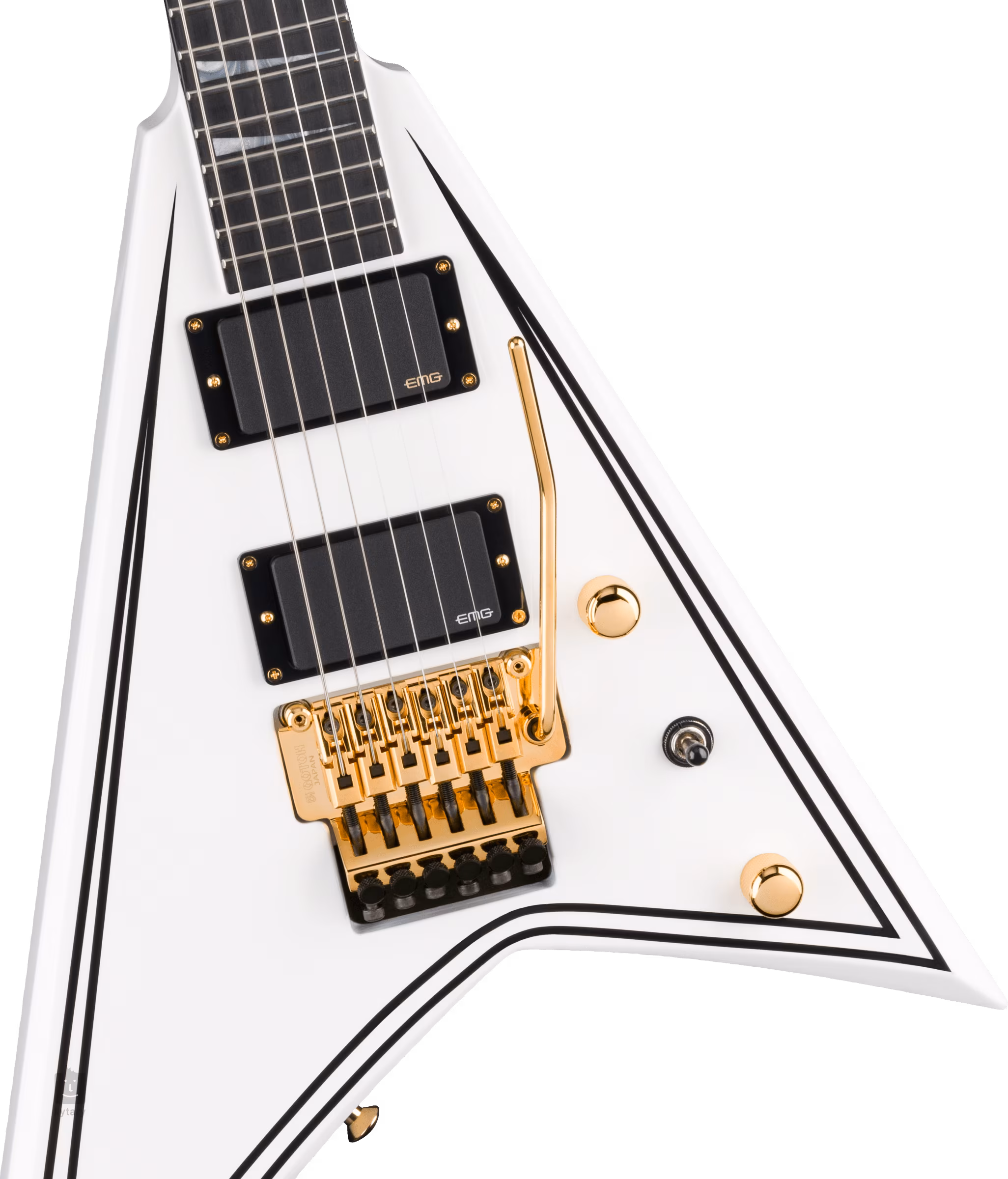 Konkrétne gitary Rhoads ponúkajú obľúbený tvar tela Flying V a vzdávajú hold Randymu Rhoadsovi, ktorý bol populárnym hráčom typu "V". Konštrukcia elektrickej gitary MJ Series Rhoads RR24MG White with Black Pinstripes pozostáva z jelšového tela a priechodného krku z troch kusov javora vystuženého grafitovou výstuhou. Táto konštrukcia má pozitívny vplyv na sustain nástroja.