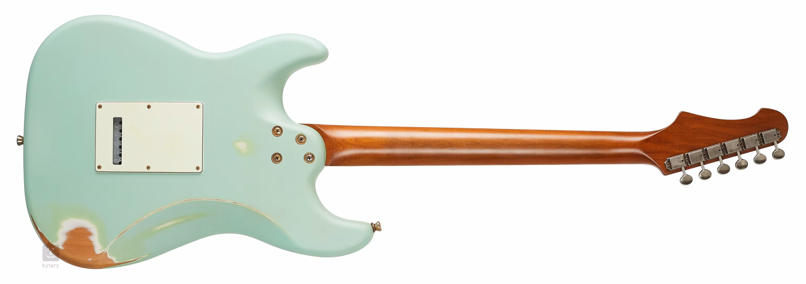 JET JS-400 RELIC SFG je elektrická gitara, ktorá ponúka dizajn, remeselné spracovanie a tradičné vlastnosti modelov ST za dostupnú cenu. Vápencové telo nástroja zdobí špeciálna povrchová úprava SFG Relic s výraznými prvkami umelej patiny. Palisandrový hmatník s dvadsiatimi dvoma pražcami je prilepený k priskrutkovanému krku z kanadského "pečeného" javora.