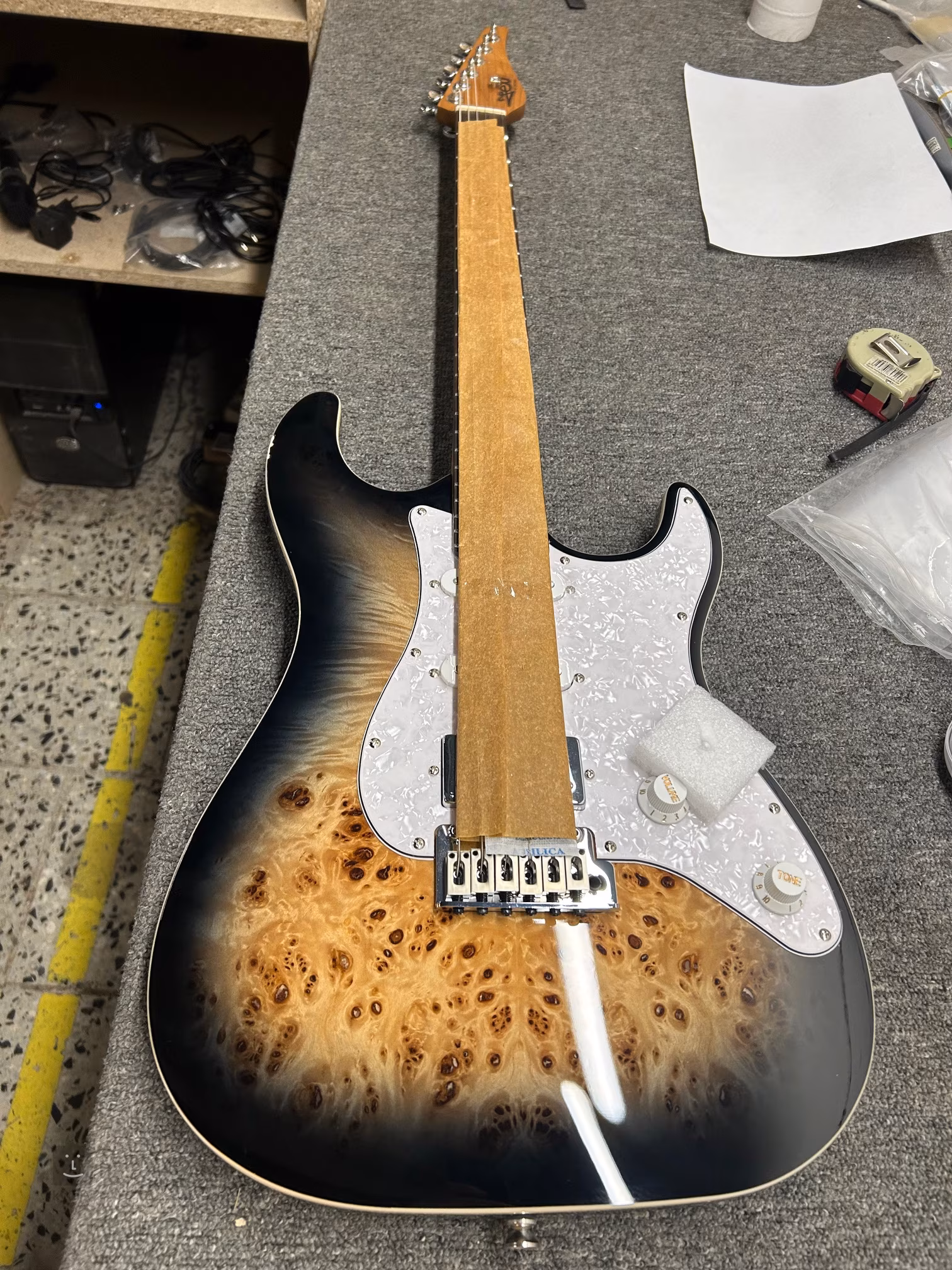 Jet JS-450Q TB R kombinuje prvky klasických modelov ST a modernejších modelov Super ST. Lipové telo nástroja zdobí efektná topoľová dýha so štruktúrou dreva podporená povrchovou úpravou Transparent Brown. Ku krku z kanadského tepelne upraveného (praženého) javora s profilom Modern C je prilepený palisandrový hmatník s dvadsiatimi dvoma pražcami.