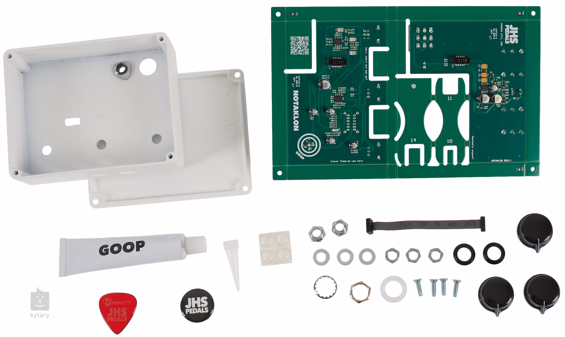 Súprava Notaklön DIY Overdrive od spoločnosti JHS Pedals je jedinečný balík pre všetkých nadšencov a kutilov, ktorí radi stavajú a montujú. Ide o pedálový efekt, ktorý je potrebné najprv zostaviť (bez spájkovania) na základe priloženého návodu - takto by to vyzeralo, keby v IKEA pracovalo viacero hudobníkov. Slovo Klon sa v názve neobjavuje náhodou, po zostavení má krabička dizajnom a charakterom zvuku najbližšie k cenenému a pomerne drahému boost/overdrive pedálu Klon Centaur z prelomu 19. a 20. storočia, ktorý si získal srdcia mnohých hudobníkov harmonickým skreslením a autentickou gitarovou odozvou.
