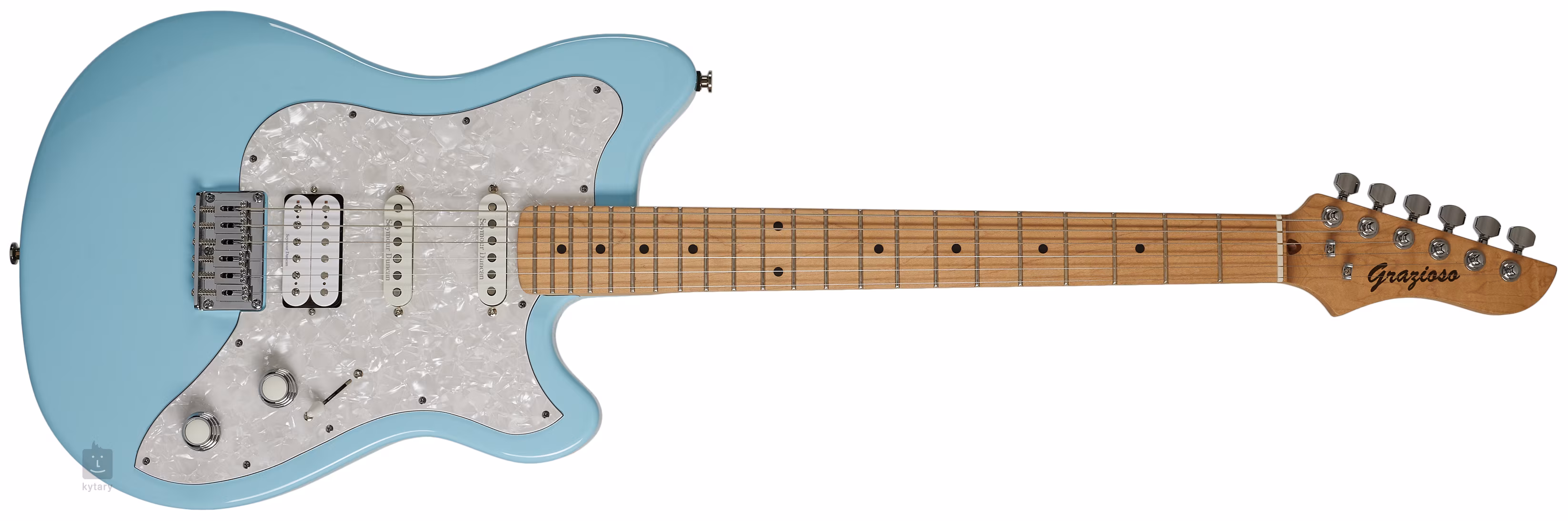 Telo modelu Grazioso II FB HSS HT RW BL je vyrobené z jelše. Javorový krk ponúka príjemný "C" profil a javorový hmatník je osadený dvadsiatimi dvoma Medium Jumbo pražcami a čiernymi pozičnými bodkami.