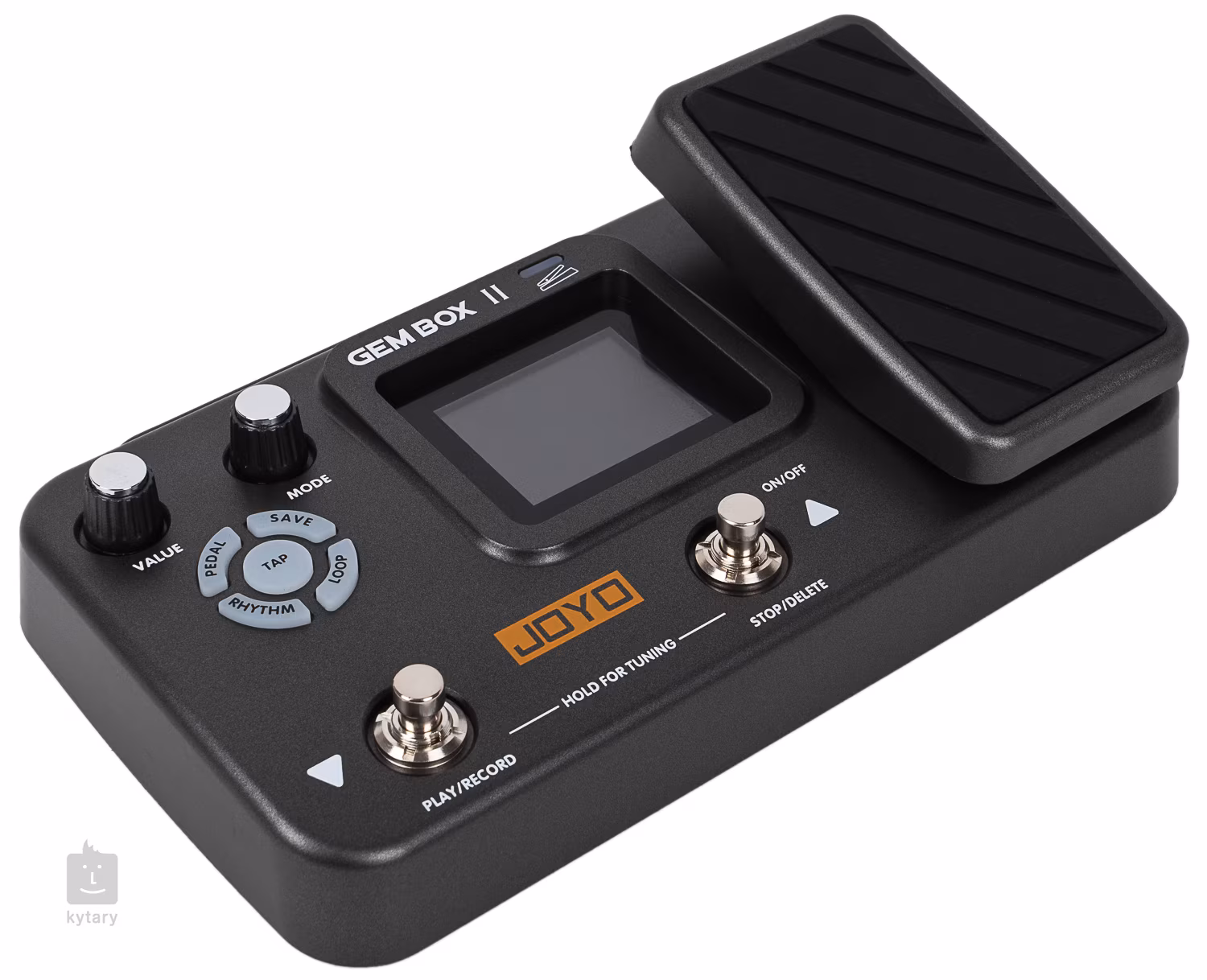 Gem Box II je nová verzia obľúbeného gitarového multiefektu od spoločnosti Joyo. Prvé vylepšenie si všimnete okamžite - oproti predchádzajúcej verzii má farebný LED displej, ktorý zobrazuje všetky aktuálne nastavenia. Na výber máte osem typov efektov (FX Module, Distortion, Amp Simulation, Noise Gate, EQ, Modulation, Delay, Reverb) a jednotlivé typy v rámci ich podskupín. Celkovo ponúka multiefekt šesťdesiatšesť rôznych zvukových efektov vrátane siedmich gitarových simulácií, štyridsiatich bicích nástrojov/vzoriek a desiatich rôznych metronómových vzorov. K osemdesiatim firemným presetom pridajte ďalších osemdesiat patchov, do ktorých môžete ukladať vlastné výtvory, teda modifikácie efektov.