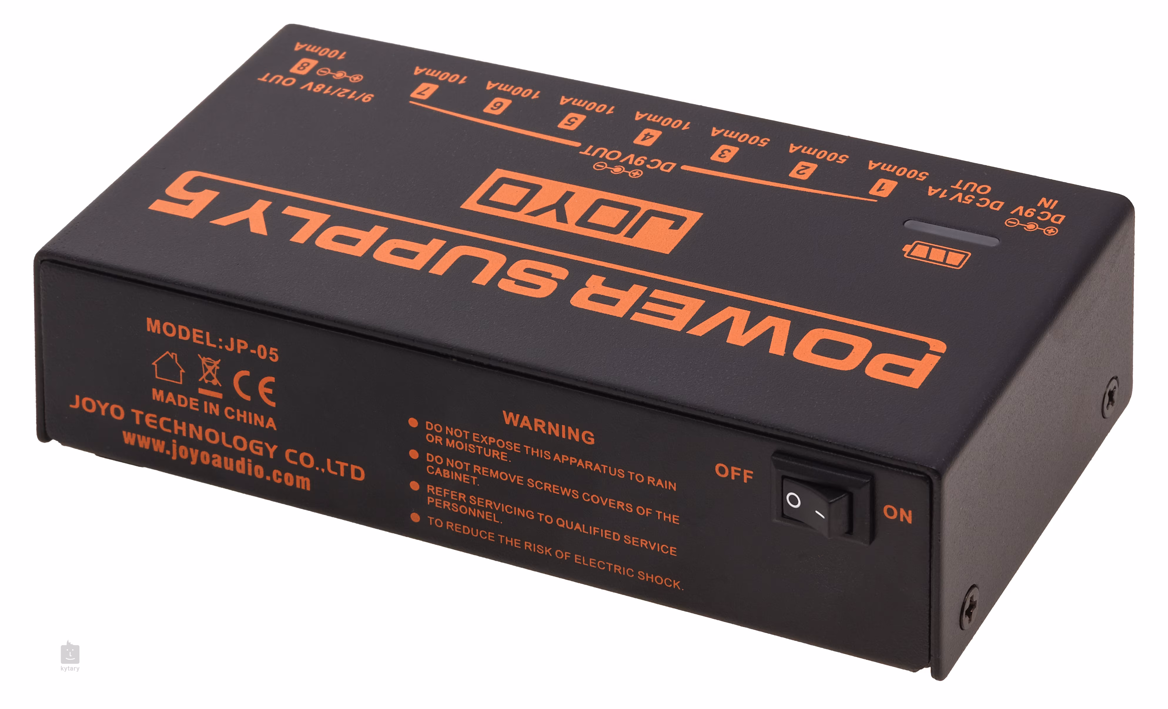 JP-05 je ďalším z radu gitarových multiadaptérov Joyo. Ponúka celkom osem výstupov pre vaše gitarové efekty, konkrétne sedem 9V výstupov (3x 500 mA, 4x 100 mA) a jeden výstup s voliteľným napätím 9, 12 alebo 18 V (100 mA). Pomocou USB portu môžete tiež napájať USB zariadenia alebo nabíjať telefón. Na napájanie samotného multiadaptéra použite 9V DC adaptér (Center Negative), ktorý je súčasťou balenia. Vďaka batériovej prevádzke sa však zaobídete aj bez napájacieho zdroja - vstavané lítiové batérie zvládnu niekoľko hodín nepretržitej prevádzky (až sedem hodín pri použití analógových pedálov a približne dve hodiny pri pripojení digitálnych pedálov). Stav batérie je indikovaný pomocou LED diódy.