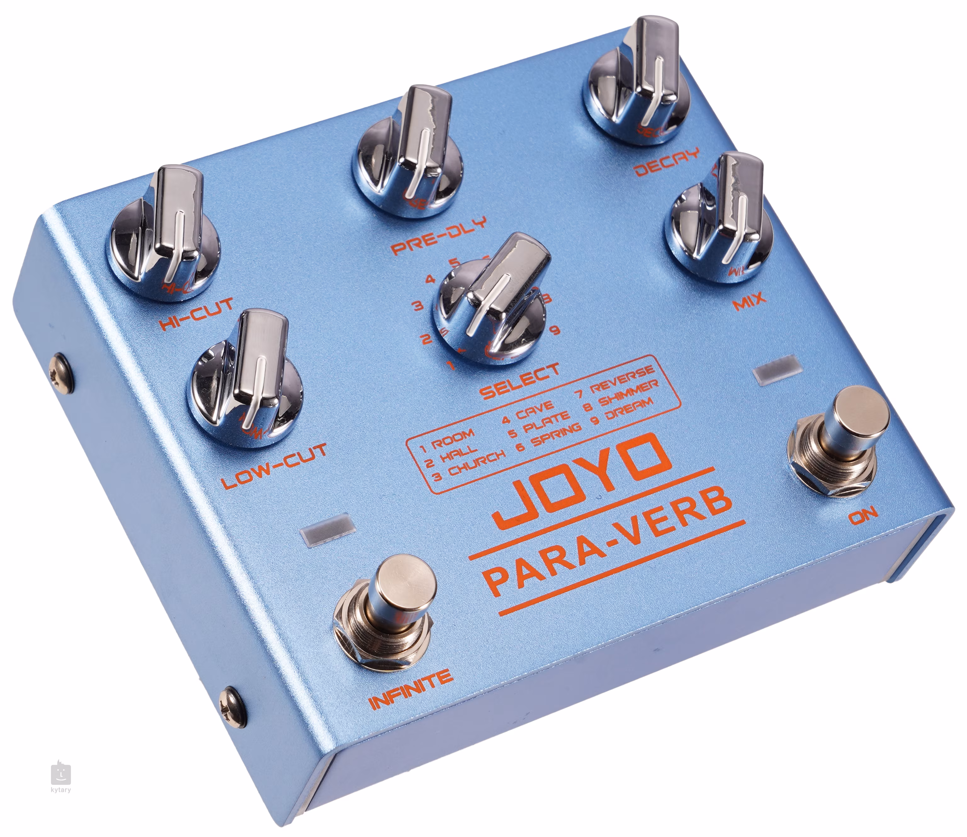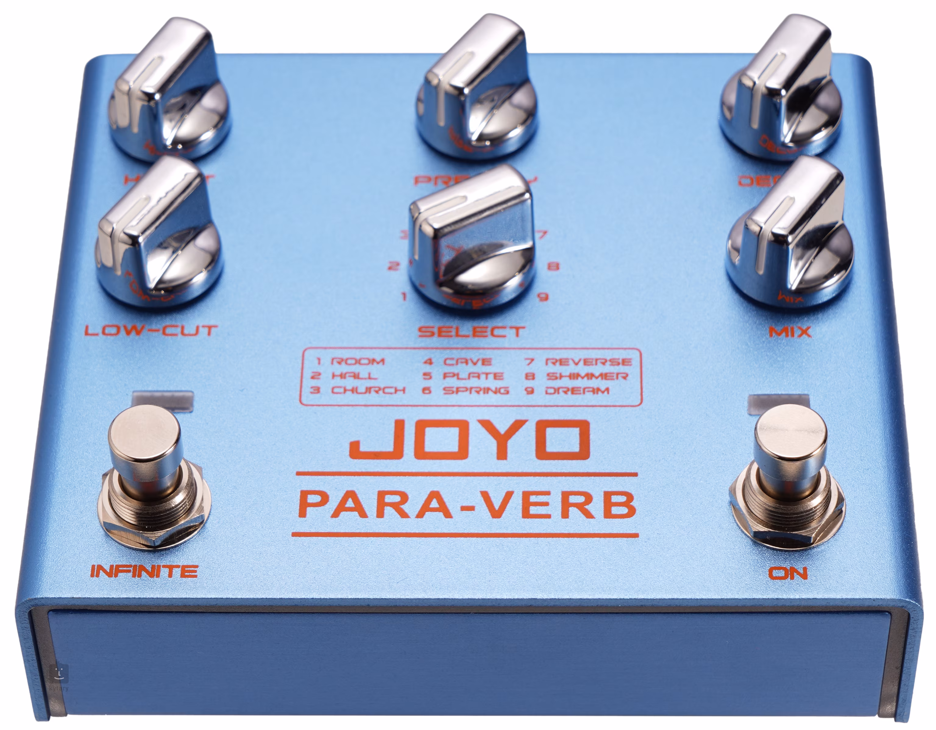 Stereo gitarový reverb Joyo R-31 obsahuje nie jeden, nie dva, ale deväť typov reverbu - Room poskytuje krátke a teplé ozveny miestnosti, Hall je dlhší a priestrannejší, simuluje priestor otvorenej haly, Church poskytuje slávnostnú a obradnú atmosféru kostola a Cave vytvára temnú a hlbokú ozvenu skalnatej jaskyne s nepravidelne tvarovanými stenami. K dispozícii je aj kovovo znejúci Plate, Spring inšpirovaný pružinovými reverbmi starých analógových strojov, Reverse vytvárajúci obrátený, reverzný reverb, Shimmer pridávajúci krásne znejúce oktávy k efektu a nakoniec Dream, ktorý je zmesou jemného viazania, modulácie a zasneného ambientného reverbu.