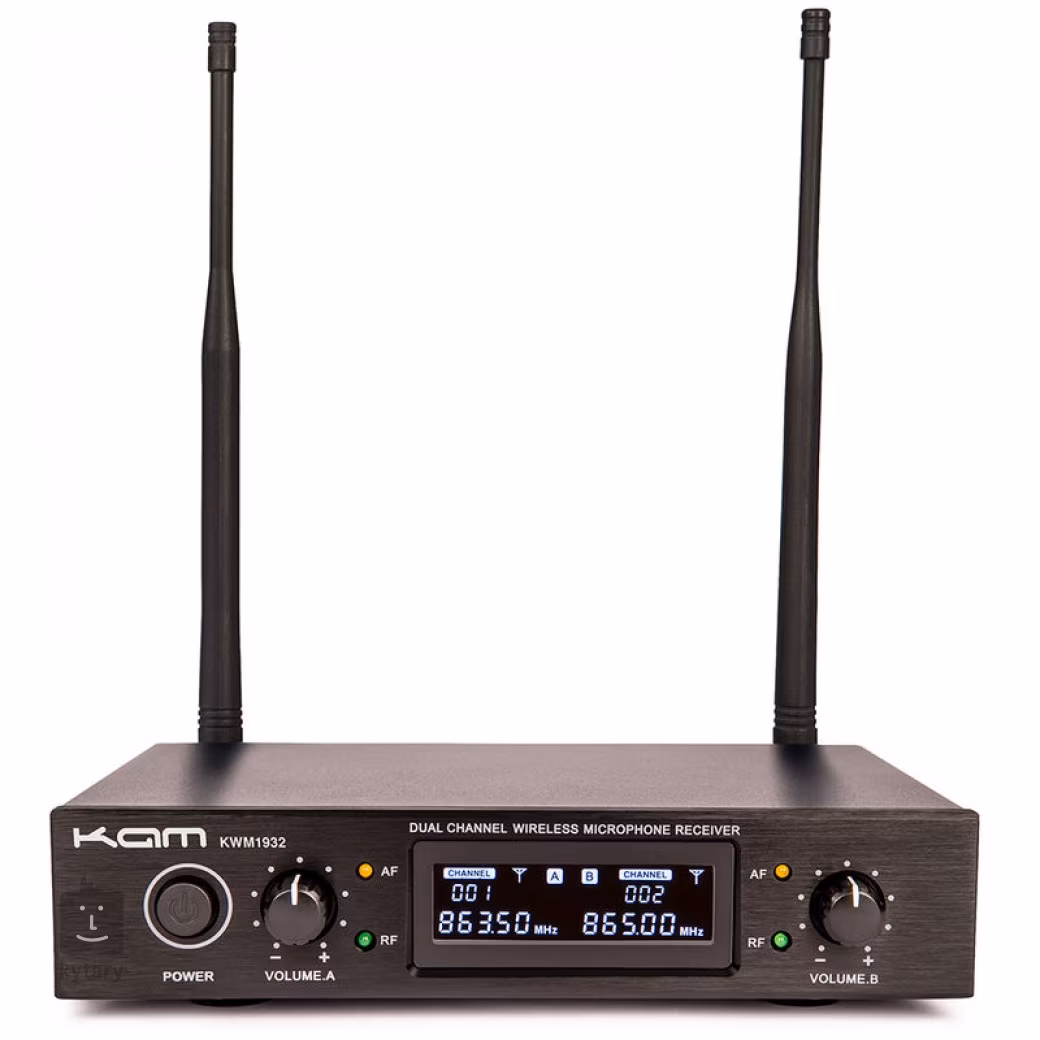 Vokální bezdrátový set od KAM vhodný pro moderátory, zpěváky nebo stand-up komiky. Přijímač disponuje přehledným LCD displejem s informací o kanálech a frekvenci. Přední panel dále nabízí dva ovladače Volume pro nastavení hlasitosti každého kanálu a LED diody pro signalizaci AF&RF kanálu. Zadní panel potom obsahuje dvě odnímatelné antény a dvojici výstupů. Přijímač pracuje s fixním počtem kanálů.