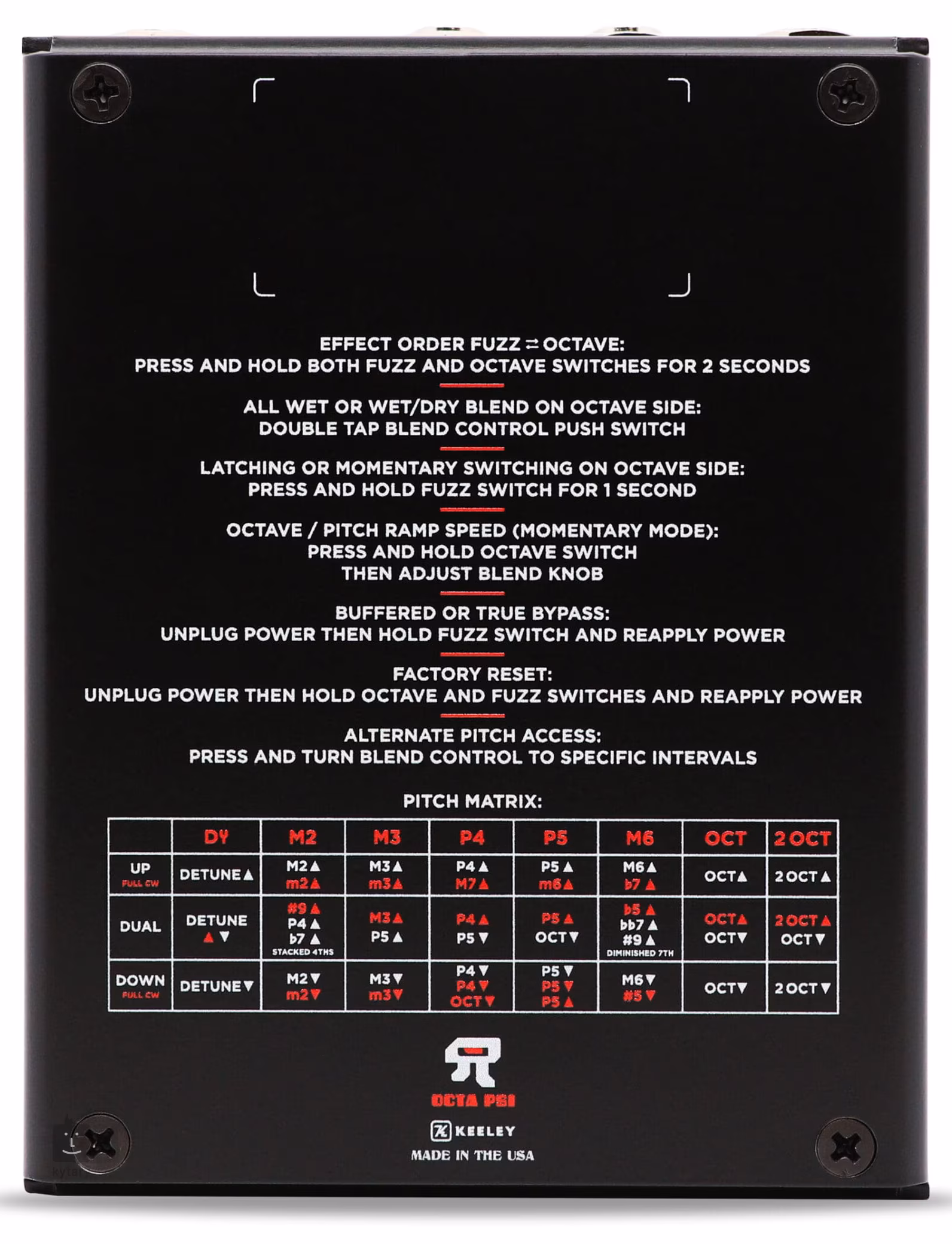 Digitálna sekcia polyfonického pitch shiftera ponúka zmenu ladenia o dve oktávy v oboch smeroch, takmer akýkoľvek harmonický interval, tri režimy (Up/Dual/Down) a rýchle sledovanie s minimálnou latenciou. Z pedálového efektu získate širokú škálu skvelých modulovaných zvukov (aj s charakterom chorus efektu). V rámci sekcie si môžete vybrať medzi nastaveniami All Wet a Dry/Wet alebo funkciami Momentary a Latching príslušného nožného spínača. Keeley Octa Psi tiež umožňuje meniť poradie sekcií Fuzz a Octave/Pitch Shifter v signálovom reťazci. Vývojári Keeley nezabudli ani na konektory pre externé kontroléry/expresné pedále, ktorými možno jednoducho a efektívne ovládať efekty octave/pitch bending.