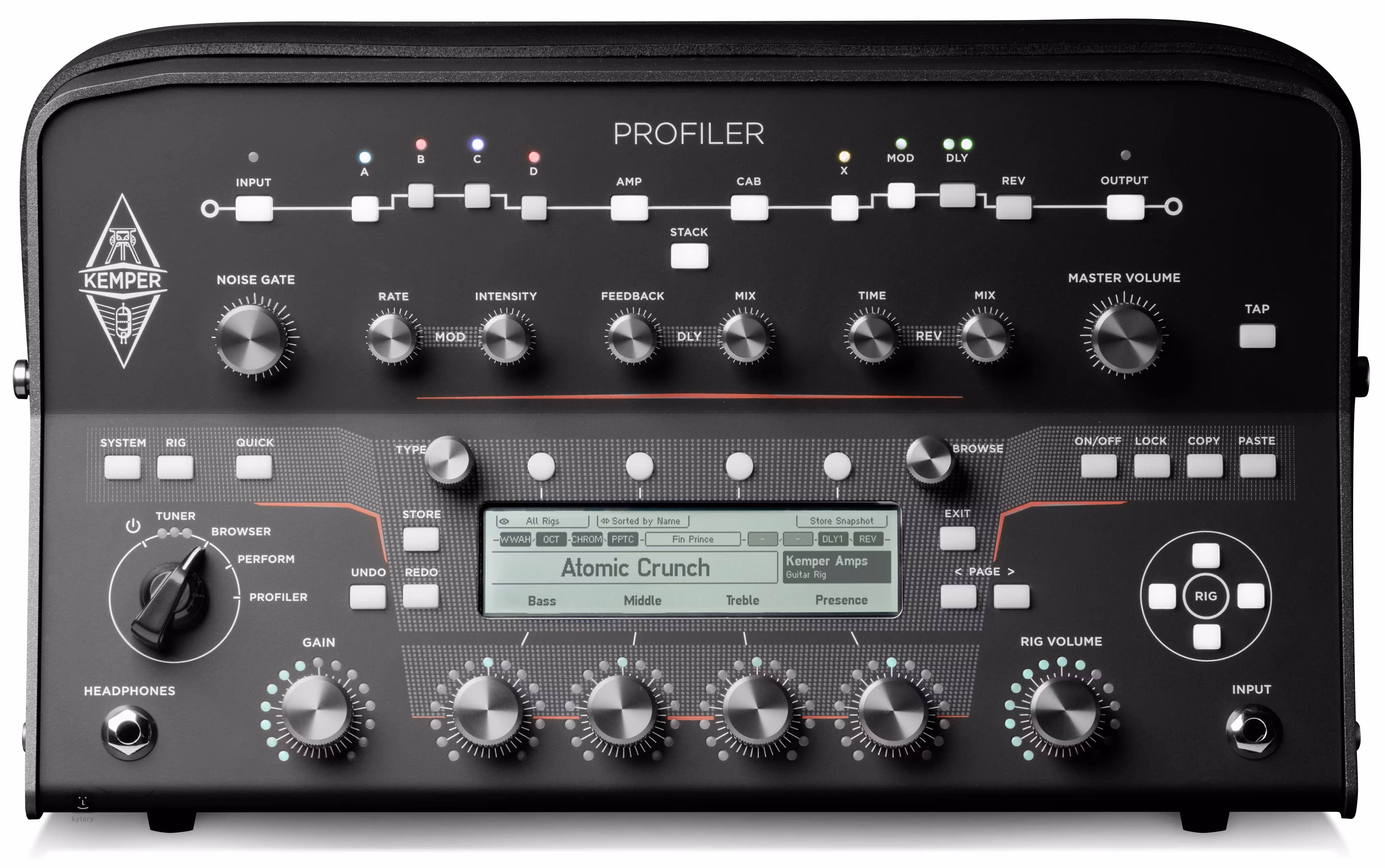 Gain, Rig Volume, Display, Buttons, Selectors, EQ (Bass, Middle, Treble, Presence), Noise Gate, Mod Rate/Intensity, Dly Feedback/Mix, Rev Time/Mix, Signal Route (Input, A, B, C, D, Amp, Stack, Cab, X, Mod, Dly, Rev, Output), Tap