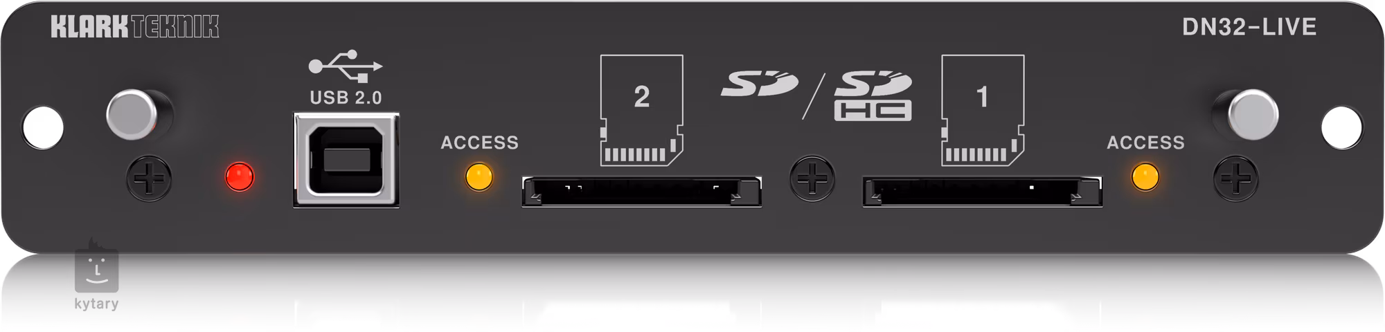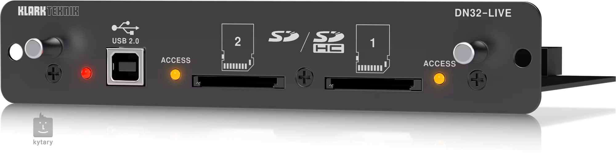 KLARK TEKNIK DN32-LIVE je rozšiřující modul se sloty pro SD/SDHC karty a USB 2.0 rozhraním pro přenos až 32 obousměrných audio kanálů a podporou přenosu MIDI a DAW ovládání.