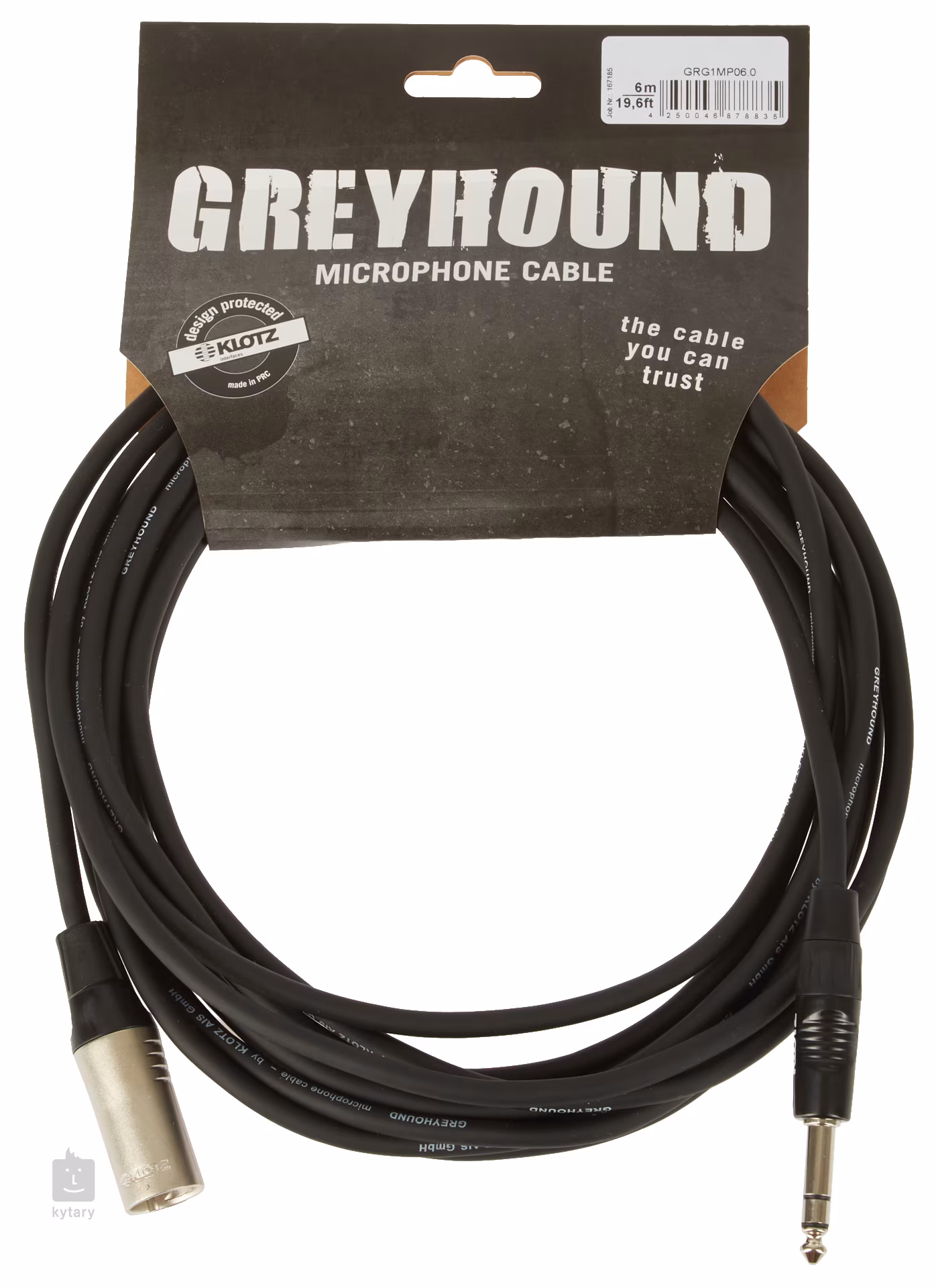 Mikrofónový kábel Greyhound GRG1MP má vysokokvalitné medené jadro s robustným PVC povrchom a je zakončený odolnými poniklovanými konektormi XLR a 6,3 mm Jack.