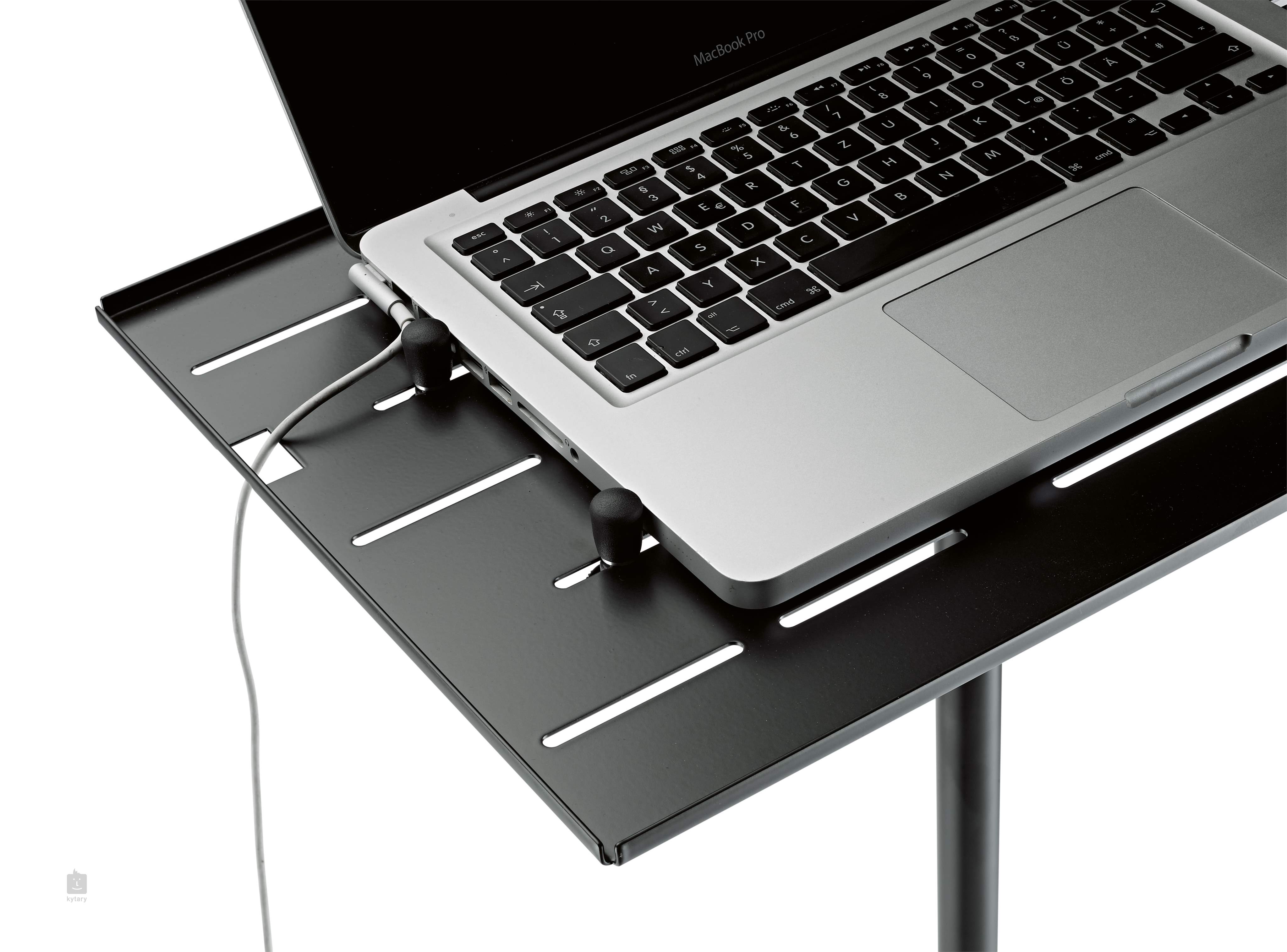 Univerzálny držiak na notebook s výškovo nastaviteľným stojanom so statívovou základňou a pracovnou plochou s rozmermi 479 x 312 mm. Horná časť obsahuje aj výrezy a štyri pogumované zarážky pre maximálnu bezpečnosť a dokonalé vedenie káblov. Okrem výšky stojana môžete nastaviť aj sklon dosky, aby bola vždy dokonale prispôsobená vašim potrebám a preferenciám. Stojan je vhodný na živé vystúpenia a štúdiové nahrávky.