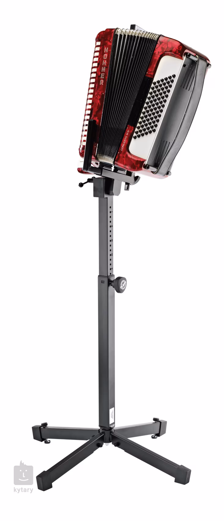 Tento univerzálny stojan na akordeón od spoločnosti K&M je dobrým riešením pre živé koncerty aj pre vystavenie v obchode. Jeho robustná konštrukcia unesie aj najťažšie nástroje a nastaviteľná výška vám umožní hrať v stoji aj v sede. Držiak stojana je možné prispôsobiť rozmerom vášho nástroja.