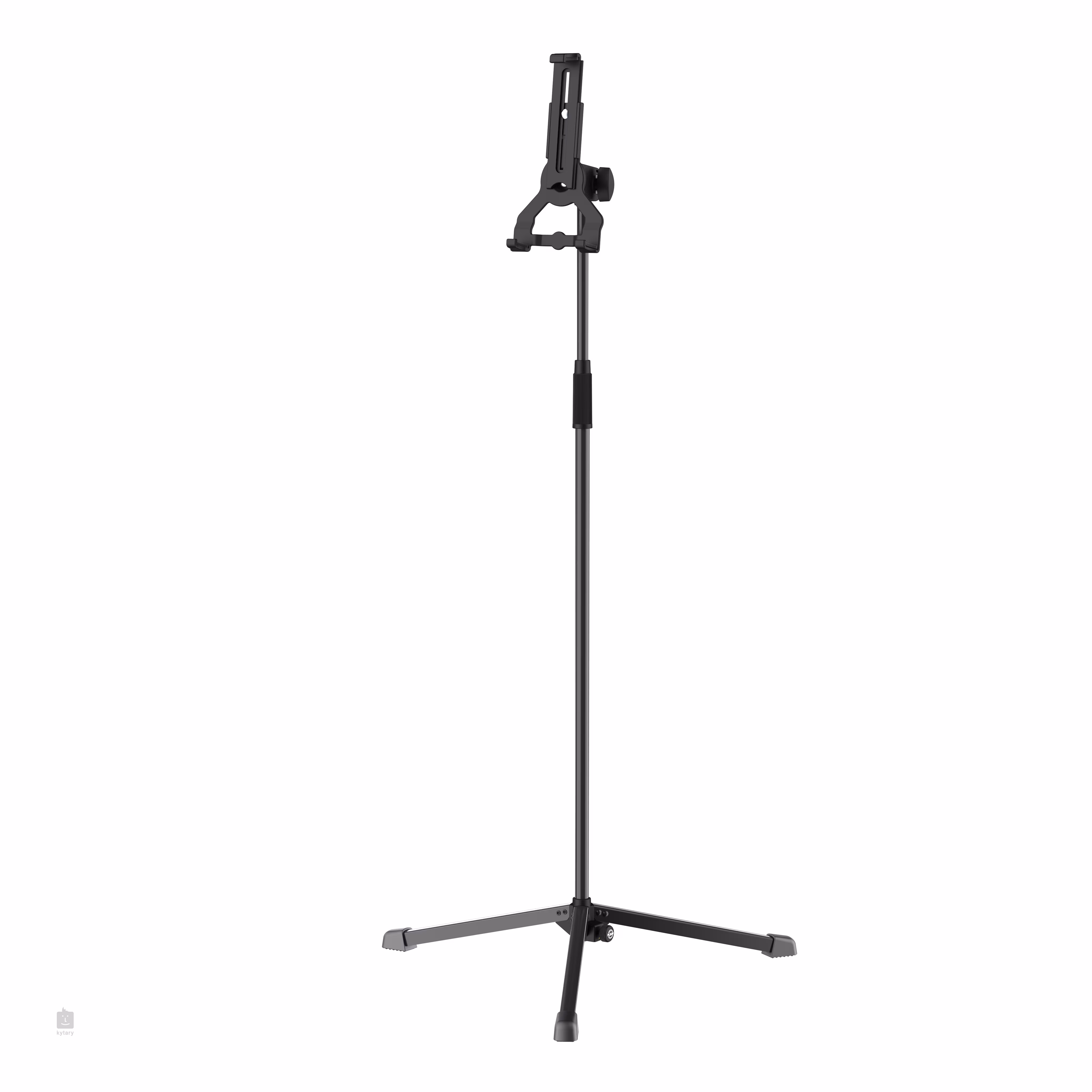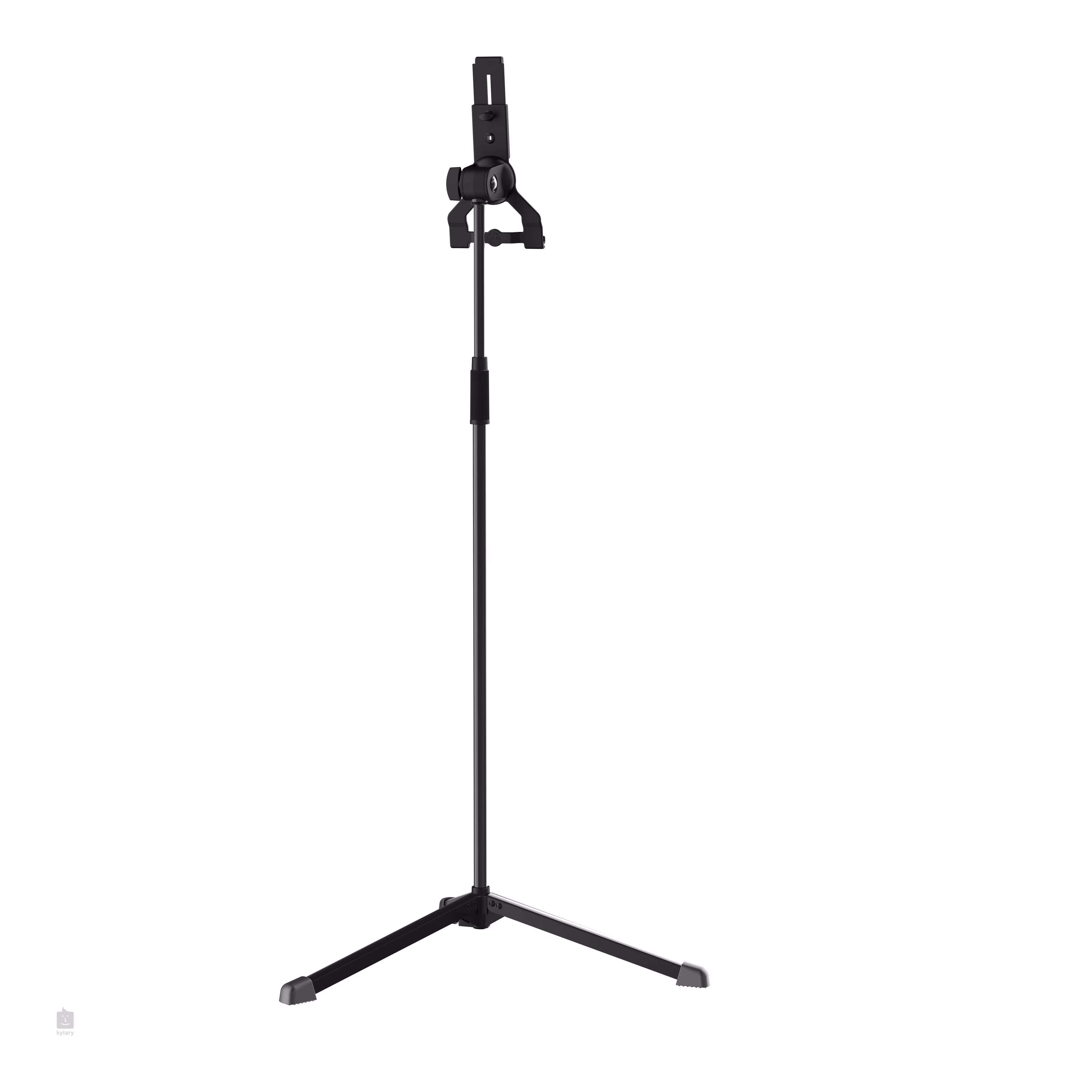Univerzálny držiak na tablet s teleskopickým stojanom vhodný na živé vystúpenia, do štúdia alebo skúšobne. Držiak môžete otáčať o 360 stupňov, takže ho môžete držať v horizontálnej (10-16-palcový tablet) alebo vertikálnej (7-13-palcový tablet) polohe. Celá konštrukcia je vyrobená z bioplastu a pogumované prvky skvele redukujú vibrácie z prostredia. Držiak možno umiestniť na mikrofónový stojan pomocou 3/8" alebo 5/8" závitu.