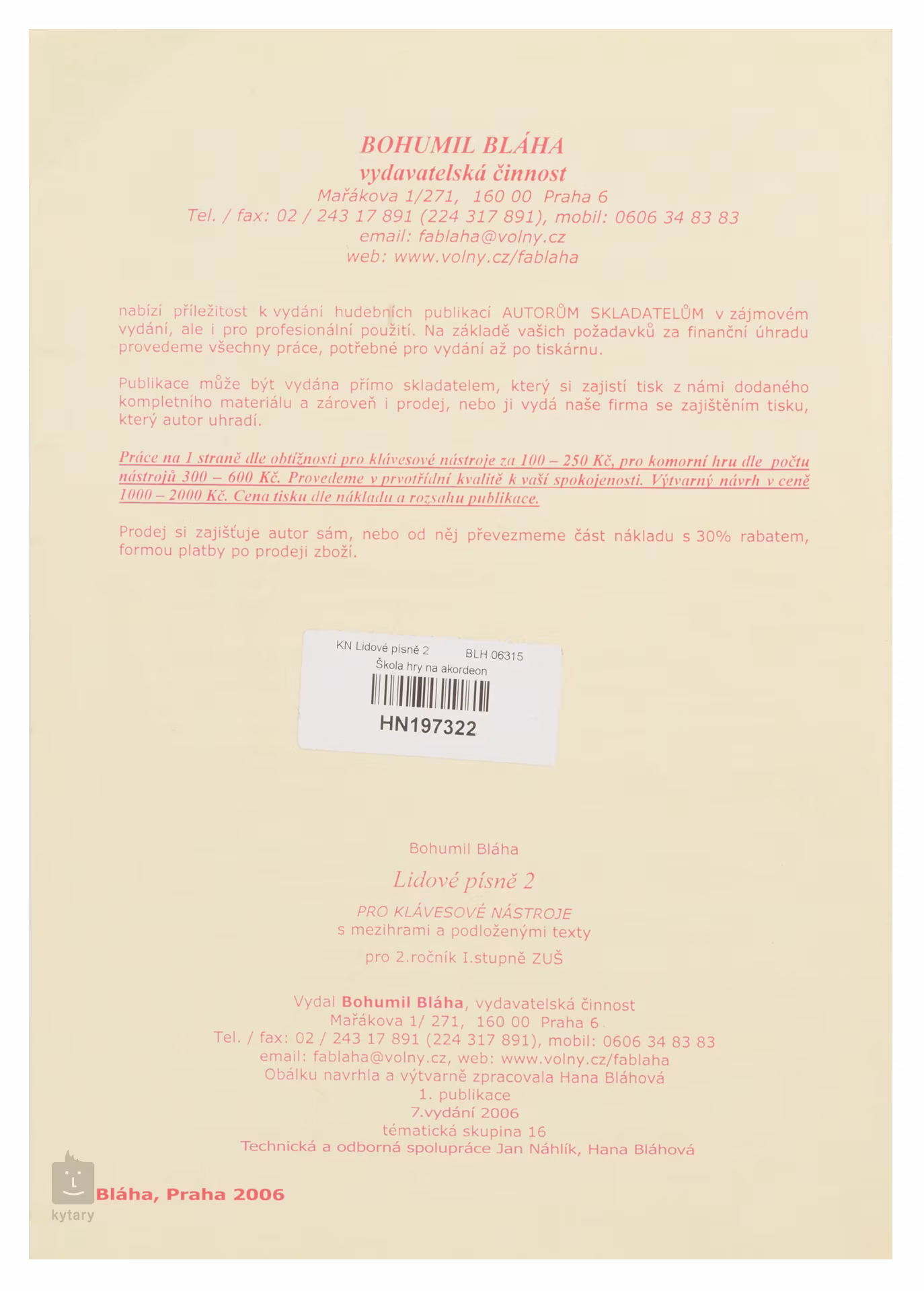 Publikácia Ľudové piesne 2 ponúka dvadsať českých, moravských, sliezskych a slovenských piesní pre žiakov 2.-3. ročníka ZUŠ v úprave pre akordeón. Možno ho použiť aj na spev a gitaru, klávesy (klavír) alebo sopránovú zobcovú flautu.