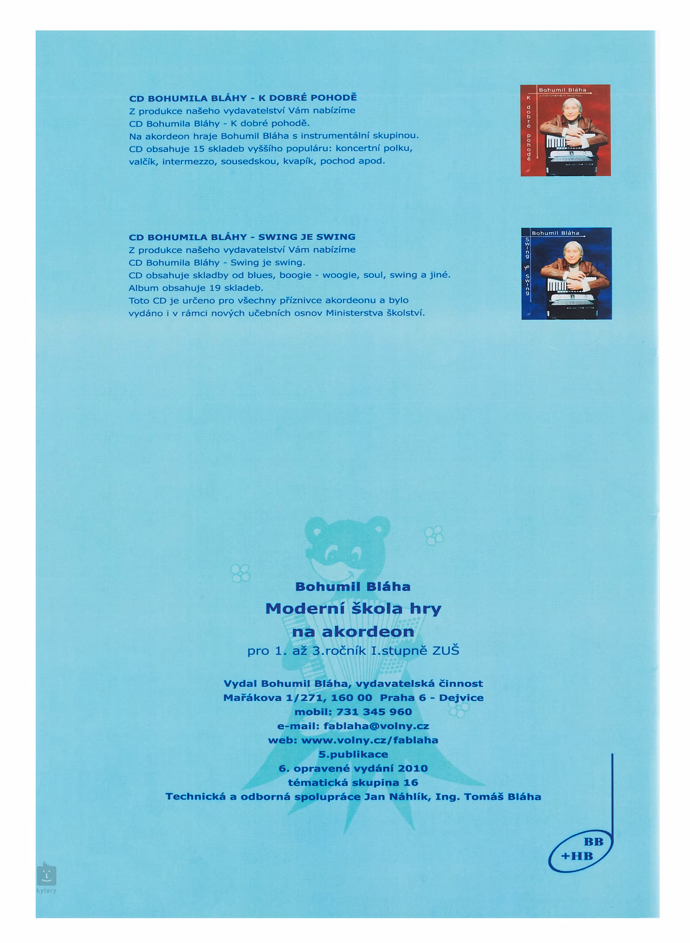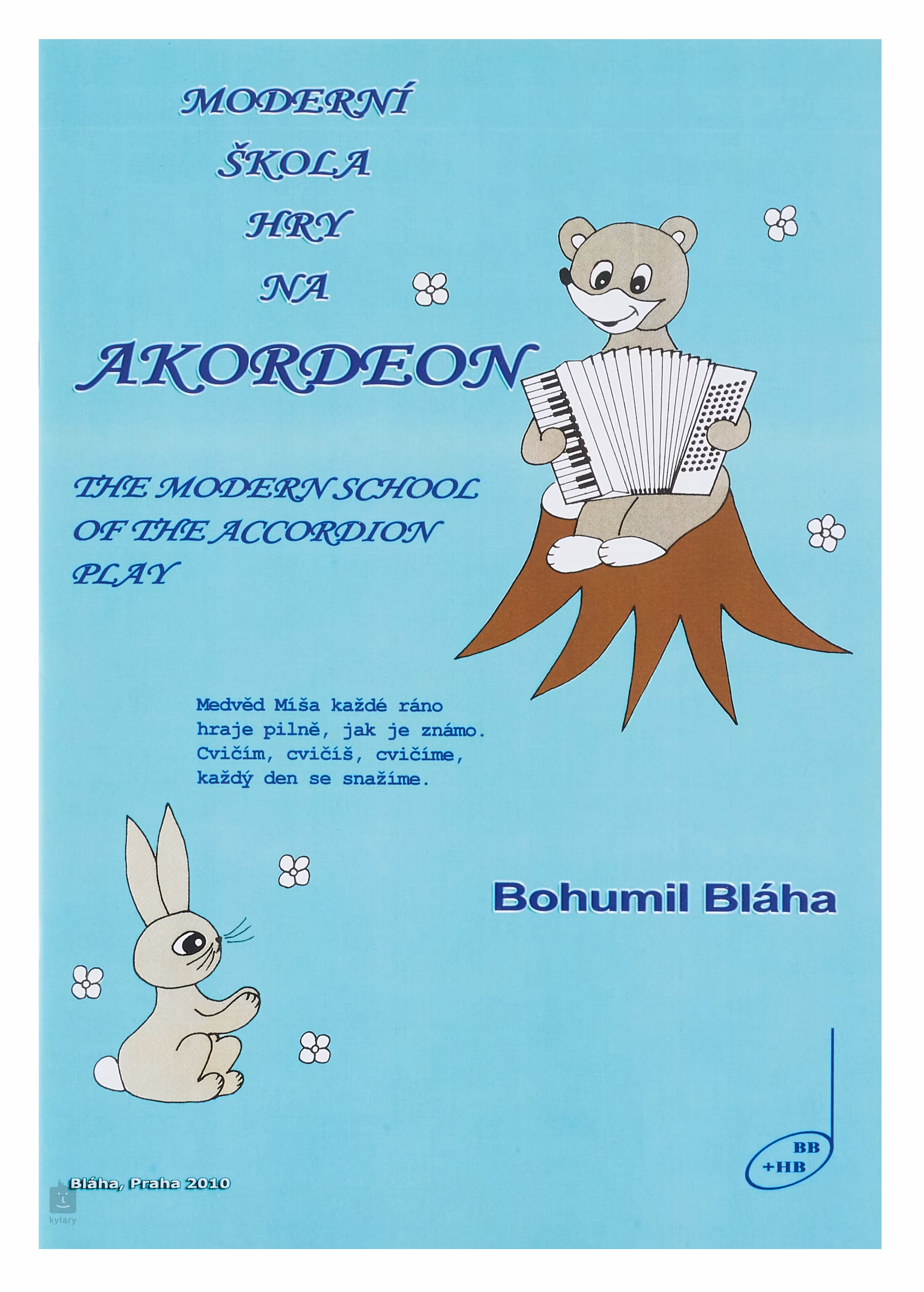 Publikácia Moderná škola hry na akordeón od akordeonistu, skladateľa a hudobného pedagóga Bohumila Bláhu zoznamuje žiakov (vhodné pre žiakov 1. - 3. ročníka ZŠ) so správnymi základmi hry na akordeón a nástrojovou technikou moderným spôsobom. Výklad obsahuje tieto témy - správne držanie nástroja a tela, práca s mechom, rytmická stránka - celé, polové, osminové, šestnástinové noty, nepravidelné delenie (triola, synkopa), cvičenia pre ľavú a pravú ruku, akordický sprievod (melodická harmónia) - ľudové piesne, stupnice, dvojzvuky, akordy, zmena polohy, recitačné skladby na precvičenie danej problematiky.