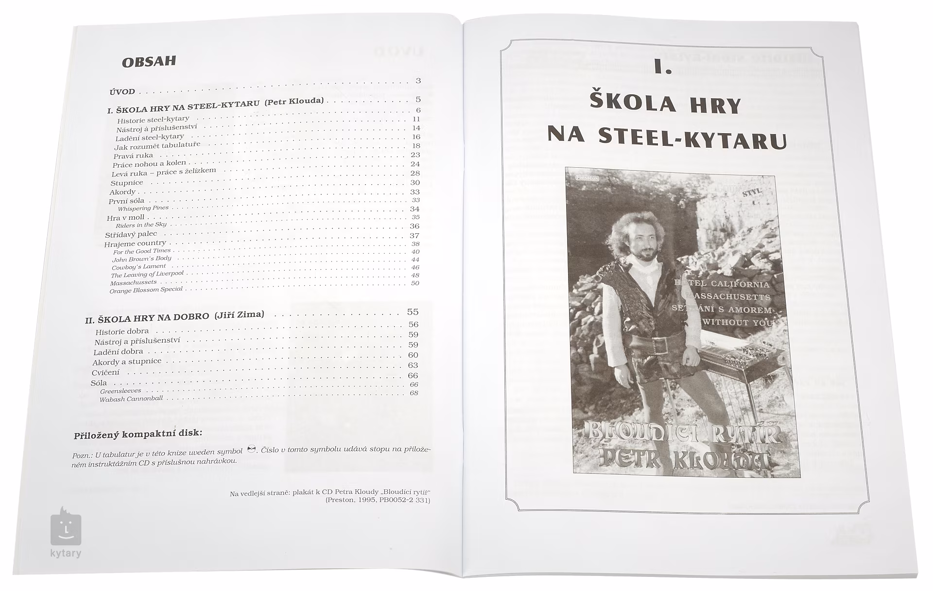 Ladenie, porozumenie tabulatúre, pravá ruka, ľavá ruka – práca s trsátkom, stupnice, akordy, sóla, striedavý palec, 6 country piesní. Autor: Petr Klouda. DOBRO: história, ladenie, akordy a stupnice, cvičenia, sóla. Autor: Jiří Zima. Všetky ukážky sú k dispozícii aj na CD. Noty, tabulatúry, fotografie