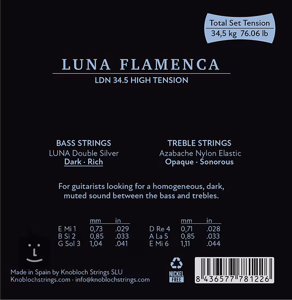 Flamencové struny LUNA FLAMENCA od spoločnosti Knobloch sú mimoriadne kvalitné struny na klasickú gitaru určené špeciálne pre hráčov flamenca. Dvojité strieborné basové struny Luna majú silný, hlboký tón, ktorý vytvára tajomnú atmosféru, zatiaľ čo vysoké nenavinuté struny vyrobené z AZ nylonu sú hutné a bohaté. Výsledkom sú rezonančné struny s temnejším zvukovým charakterom, ktoré sa dokonale hodia k štýlu, pre ktorý boli vytvorené.