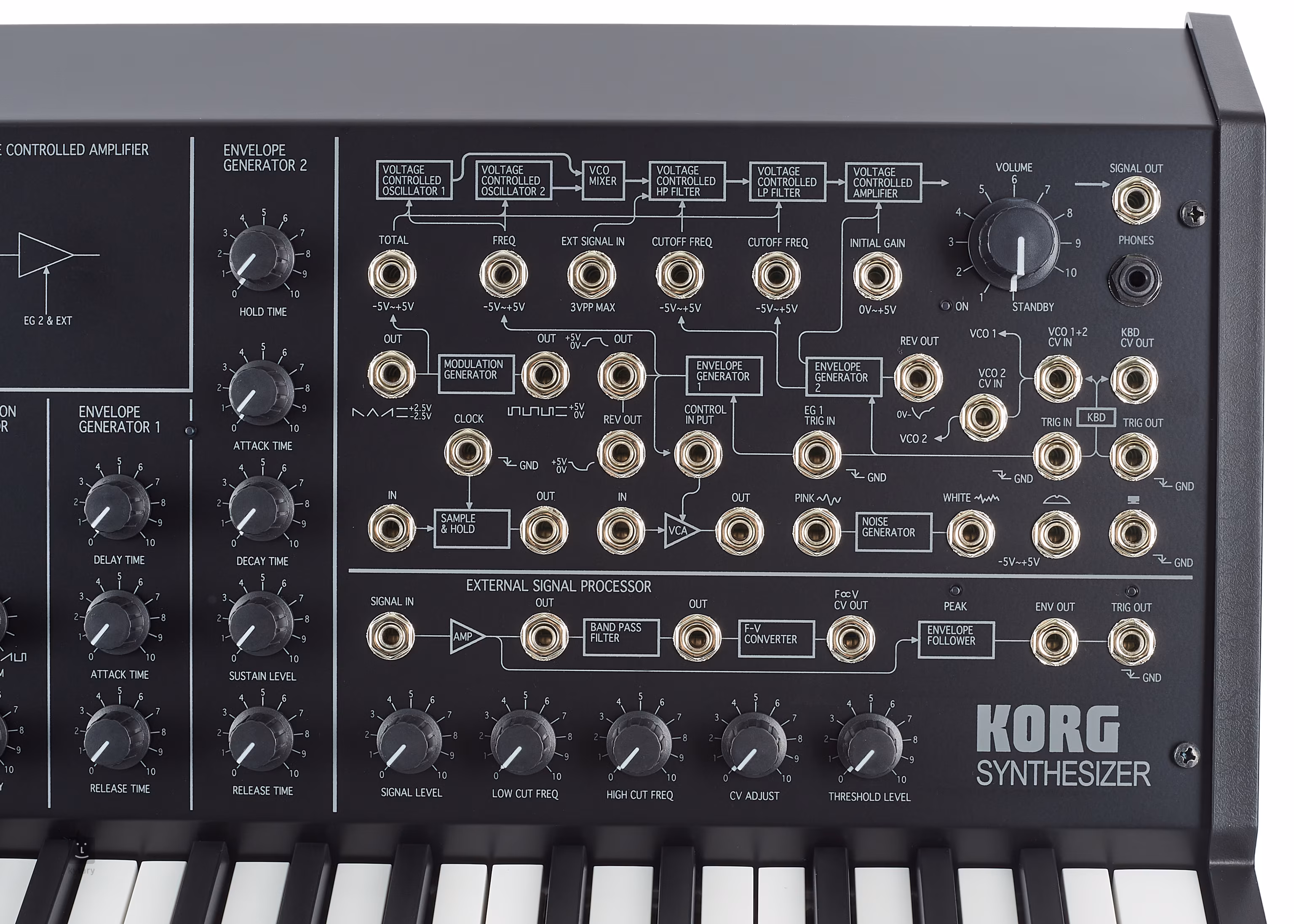 Mimoriadne flexibilný systém smerovania signálu Systém smerovania signálu pomocou patch káblov a konektorov umožňuje vytvárať veľmi komplexné zvuky. Možnosti sú obmedzené len fantáziou používateľa; kombinácie prepojenia rôznych jednotiek môžu vytvárať neuveriteľnú škálu úplne odlišných zvukov. Tabuľka prevzatá z MS-20, vytlačená na ovládacom paneli, pomôže začiatočníkovi zorientovať sa